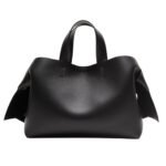 The tote is designed with versatility in mind, featuring both top handles and a detachable shoulder strap, allowing it to be carried by hand or worn over the shoulder. This adaptability makes it suitable for various occasions, from business meetings to casual outings. The bag’s minimalist exterior is adorned with subtle Acne Studios branding, maintaining the brand’s commitment to understated luxury.