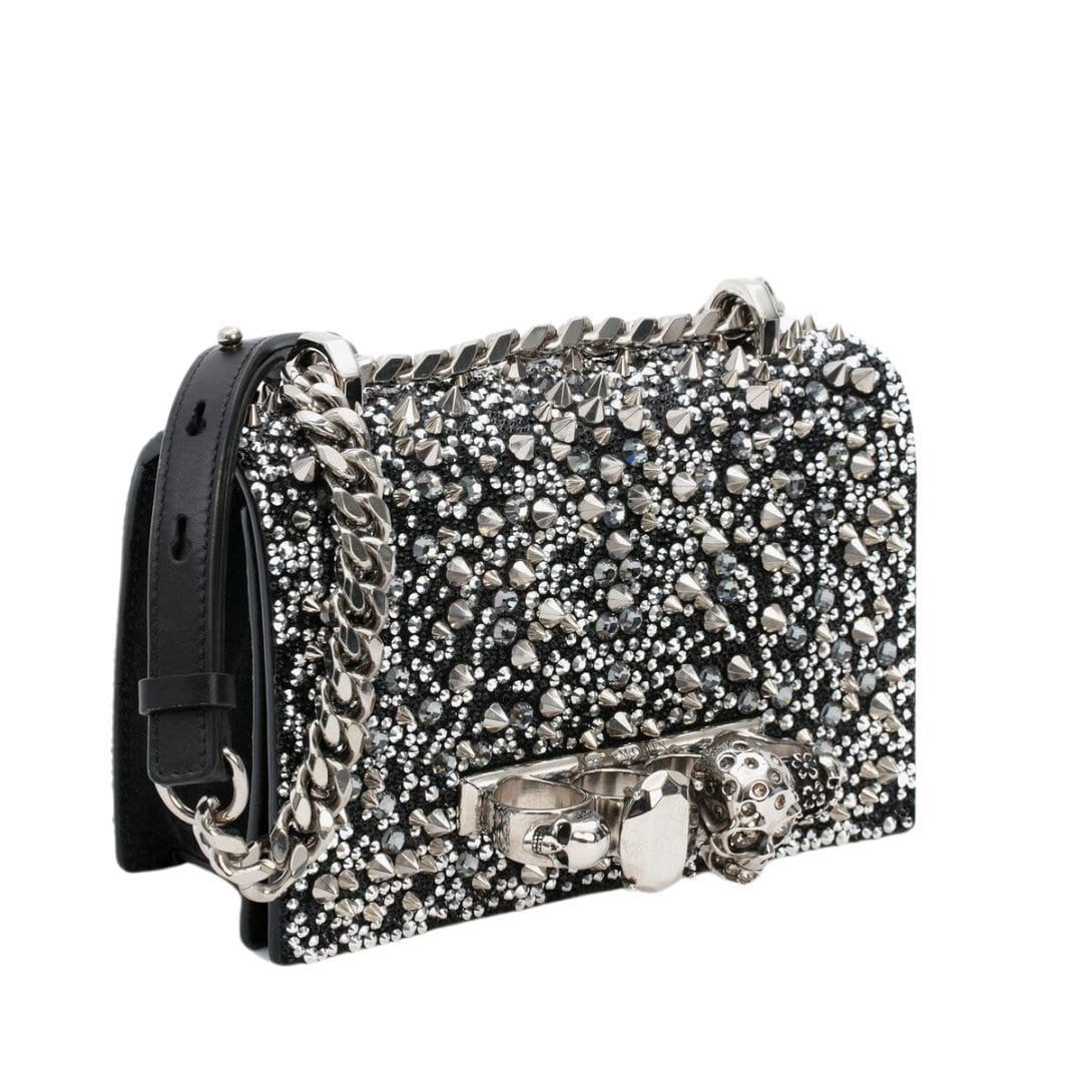This Alexander Mcqueen Womans Crystal Embellished Mini Jewelled In Blacksilver exemplifies the superior quality and timeless elegance of Italian craftsmanship. Its combination of practical features and opulent design makes it an ideal accessory for special occasions, ensuring you carry your essentials with both style and sophistication.