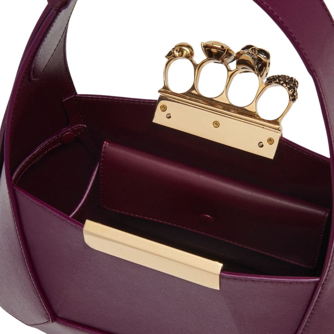 Introducing the Alexander McQueen Womens the Jewelled Hobo bag in burgundy, crafted from smooth calfskin leather with an antique silver-finished handle adorned with crystal-encrusted rings. Inspired by the faceted stone on the Knuckle, its unique silhouette features leather panels that are intricately cut and re-assembled.