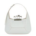 Introducing the Alexander McQueen Women’s the Jewelled Hobo bag in ivory, crafted from smooth calfskin leather with an antique silver-finished handle adorned with crystal-encrusted rings. Inspired by the faceted stone on the Knuckle, its unique silhouette features leather panels that are intricately cut and re-assembled.