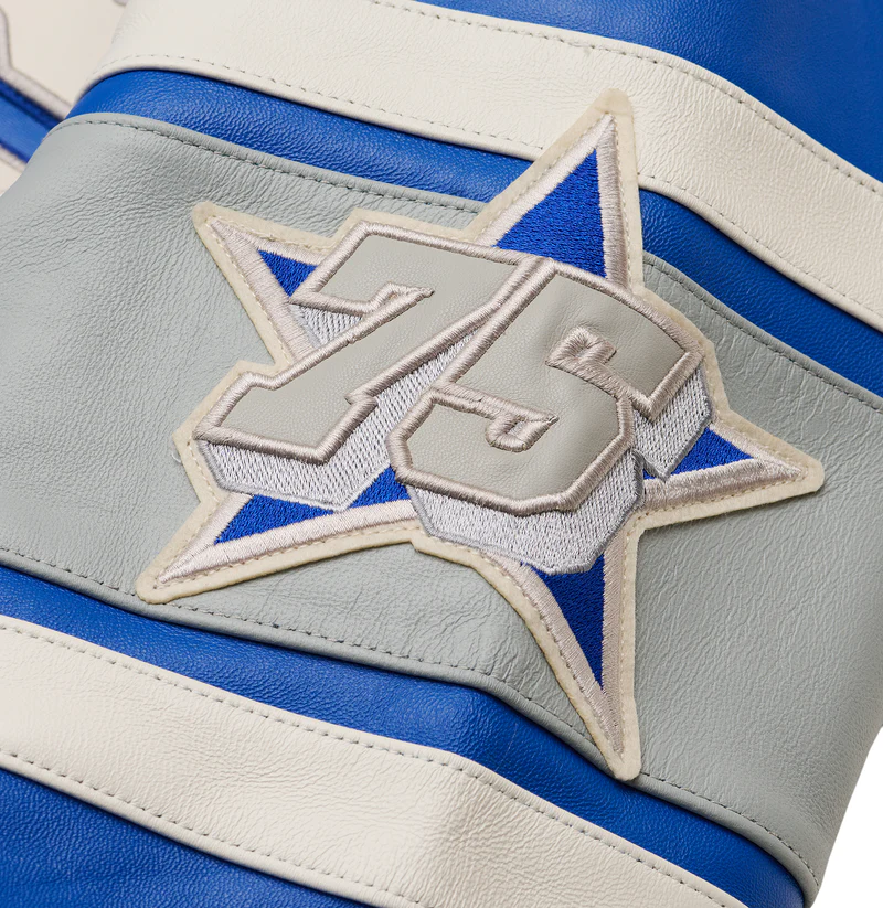 Avires Detroit USA Leather Jacket Blue in 100% antique European lamb leather. Features custom Detroit art patch set and applique lining art. Wide stripe detailing on sleeves.