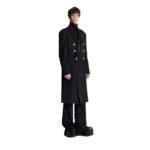 Drawing inspiration from military attire, the coat boasts a structured yet fluid construction, characterized by sharp lines and precise tailoring. The pronounced shoulders and fitted waist create a powerful silhouette, enhancing the wearer’s stature and exuding confidence. The double-breasted front with embossed gold-tone buttons further reinforces its military influence, adding a touch of opulence to its design.