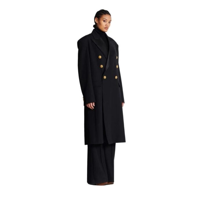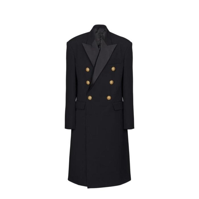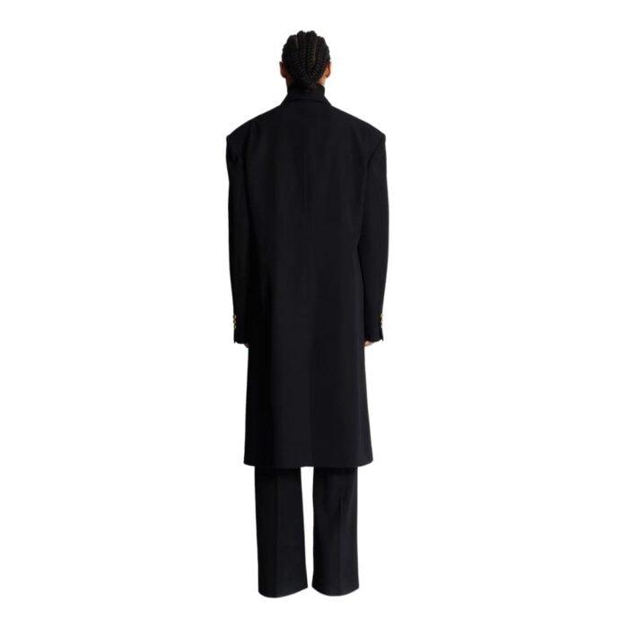 Drawing inspiration from military attire, the coat boasts a structured yet fluid construction, characterized by sharp lines and precise tailoring. The pronounced shoulders and fitted waist create a powerful silhouette, enhancing the wearer’s stature and exuding confidence. The double-breasted front with embossed gold-tone buttons further reinforces its military influence, adding a touch of opulence to its design.