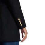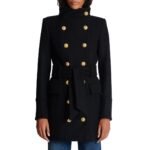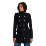 The design features a double-breasted front, a hallmark of traditional officer coats, adorned with gold-tone embossed buttons that add a touch of opulence. The structured silhouette is tailored to perfection, providing a flattering fit that accentuates the waist, thanks in part to the accompanying belt. This belt, bearing the iconic Balmain logo on its buckle, cinches the waist, enhancing the coat’s hourglass shape and adding a bespoke touch to the overall design.