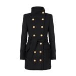 Epaulettes on the shoulders further emphasize the military inspiration, while the sharp, peak lapels bring a modern twist. The coat’s length, typically falling just above the knee, ensures it is versatile enough to pair with both formal and casual outfits. The rich fabric not only offers warmth and comfort but also displays a refined texture that speaks to Balmain’s commitment to quality and craftsmanship.