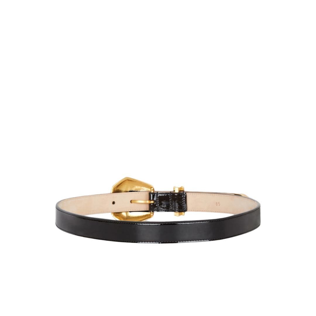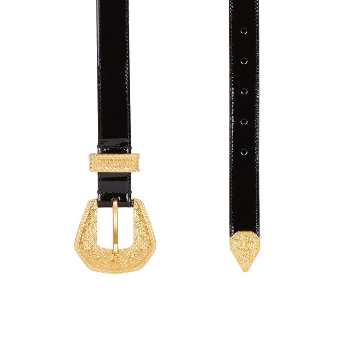 The juxtaposition of the sleek patent leather against the bold hardware creates a striking visual contrast, elevating the belt to a coveted accessory that effortlessly complements any ensemble. Whether cinched around the waist of a flowing maxi dress or worn low-slung with tailored trousers, it adds a touch of edge and sophistication to every look.BALMAIN PATENT LEATHER WESTERN BELT