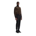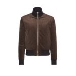 The silhouette of the jacket is tailored to perfection, with a contemporary fit that flatters the physique. The classic bomber style features ribbed cuffs, collar, and hem, adding a touch of sporty elegance to the design. Additionally, practical elements such as zippered pockets offer functionality without compromising on style.