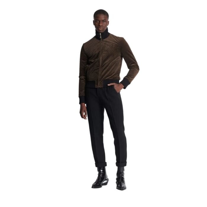 At first glance, the bomber jacket captivates with its striking monogram pattern adorning the entirety of the garment. The intricate Balmain monogram, meticulously woven or printed, exudes opulence and sophistication, serving as a testament to the brand’s illustrious heritage and status in the fashion world. The monogram, rendered in a contrasting color palette, adds depth and dimension to the jacket, creating a visually captivating allure.