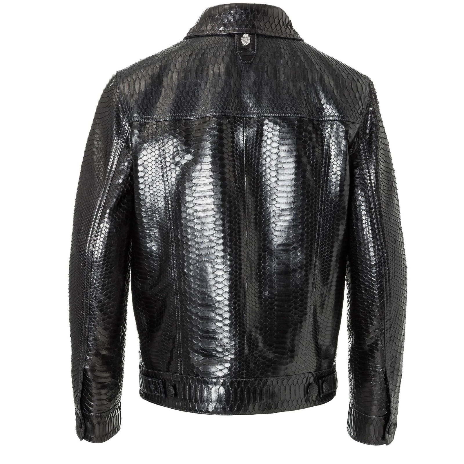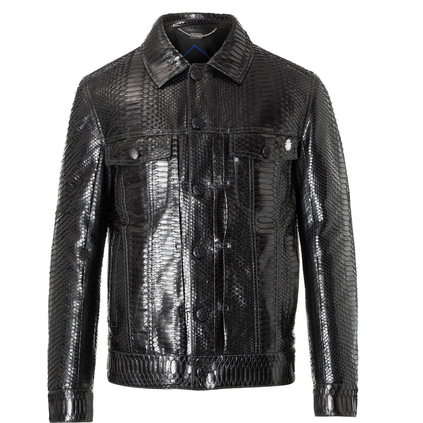 Introducing the billionaire leather jacket ”HENRI”, Python Skin Denim-Style Jacket, a fusion of rugged denim charm and luxurious python skin opulence. This jacket embodies the perfect balance of edgy style and timeless elegance.