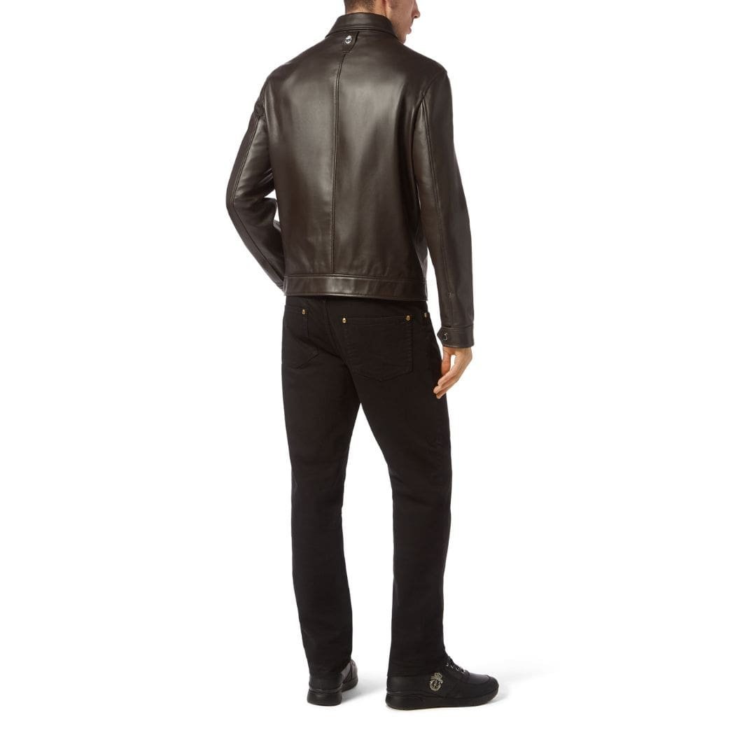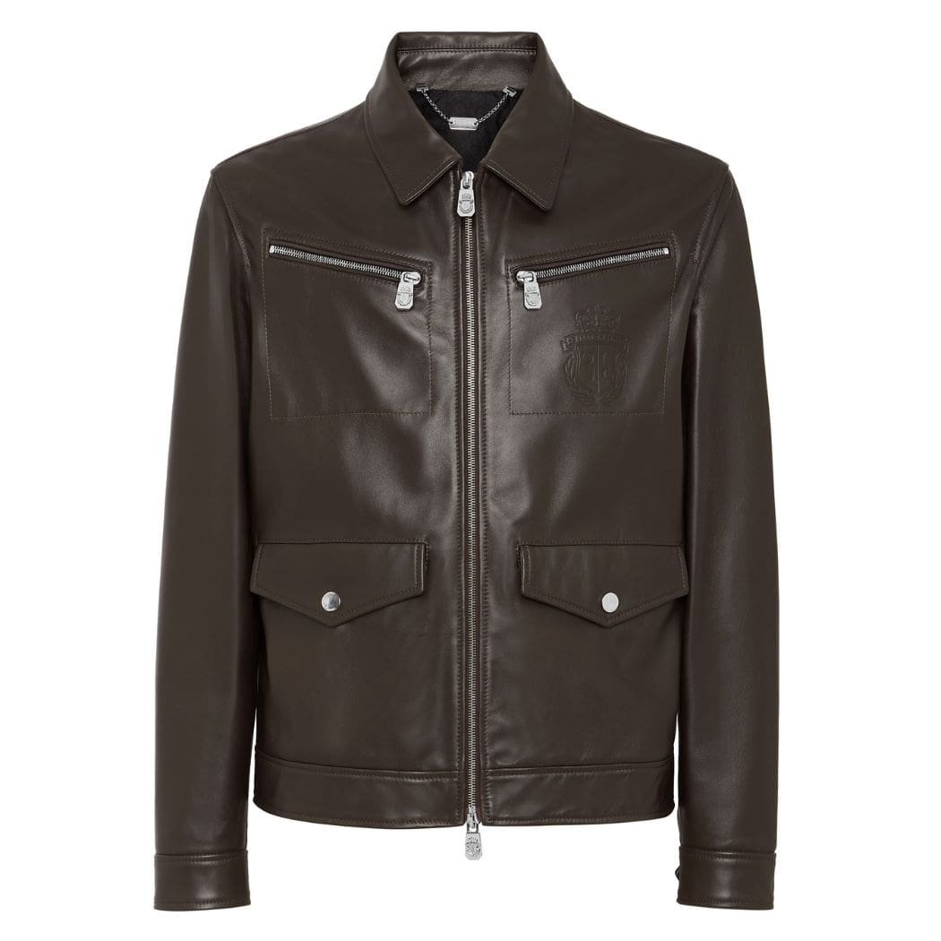 Indulge in the delight of discovering elegance with our exquisite soft billionaire Nappa leather jacket, perfect for all occasions. Crafted with care from luxurious soft nappa leather, this jacket features an embroidered crest at the left chest and a logo stud meticulously sewn onto the hang loop at the yoke, adding a touch of sophistication. With a convenient zip fastener and a combination of two flap pockets with press studs and two zip-up pockets, it offers both style and practicality. Complete with press stud cuffs and a jacquard satin lining, this jacket is a testament to refined taste and impeccable craftsmanship.