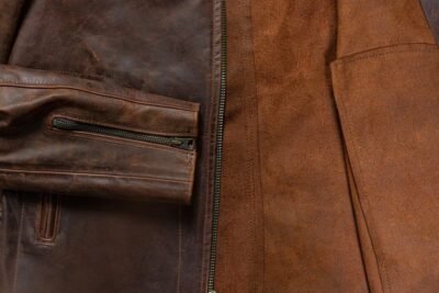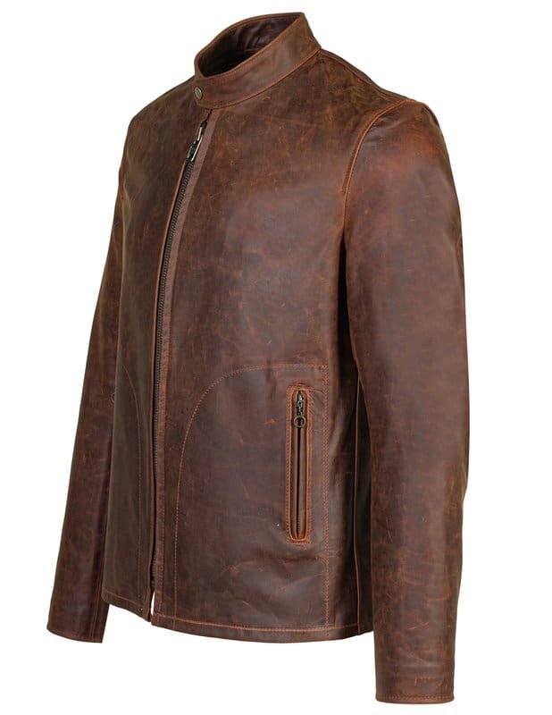 26″ lightweight vintaged oiled unlined cowhide cafĂ© racer with two lower front zipper pockets, zipper sleeve cuffs, and poly sleeve lining.