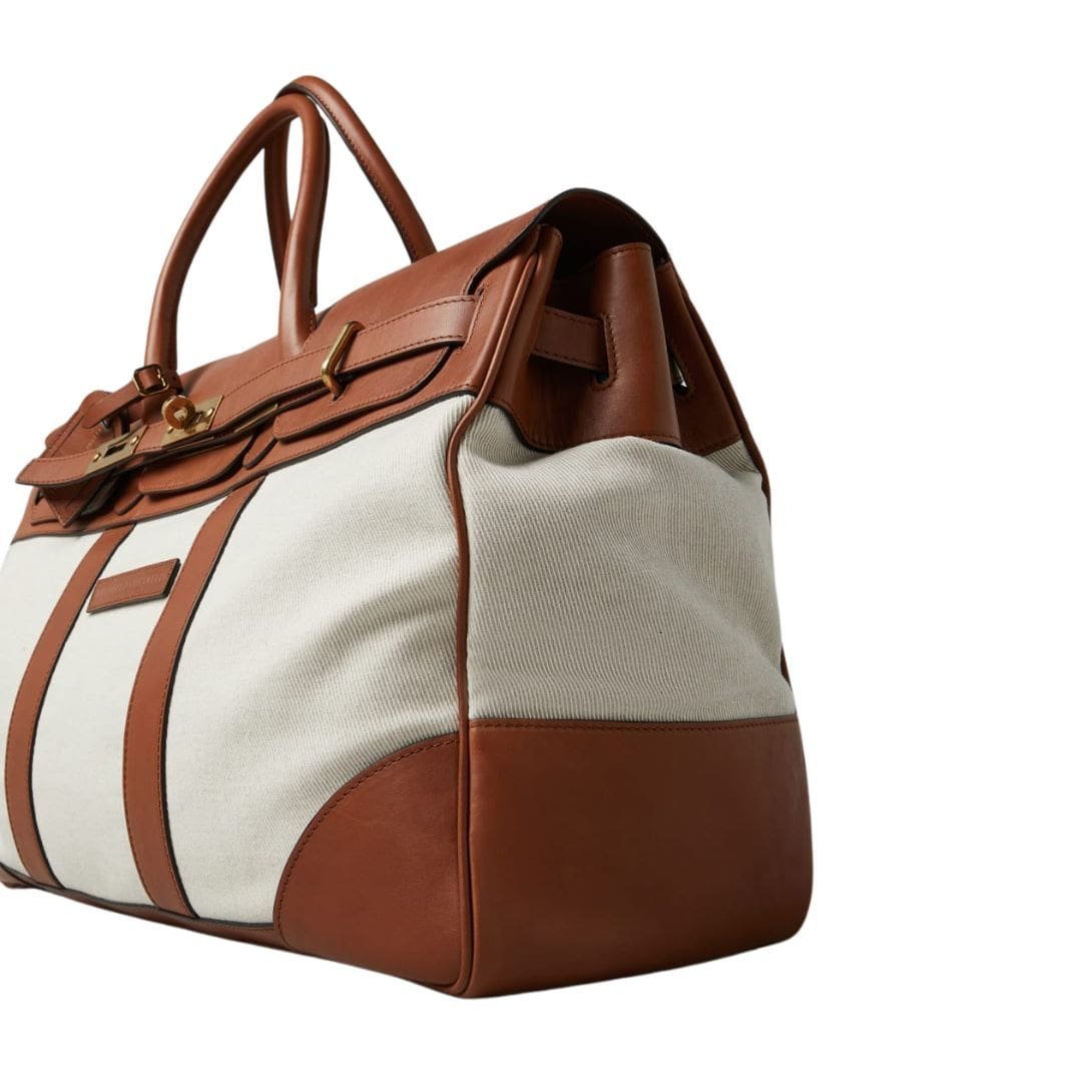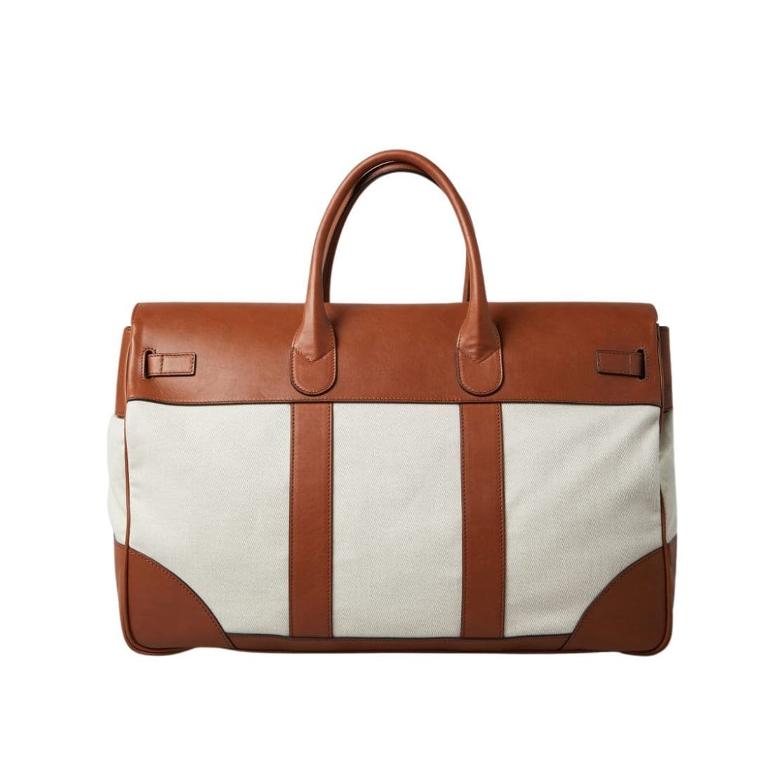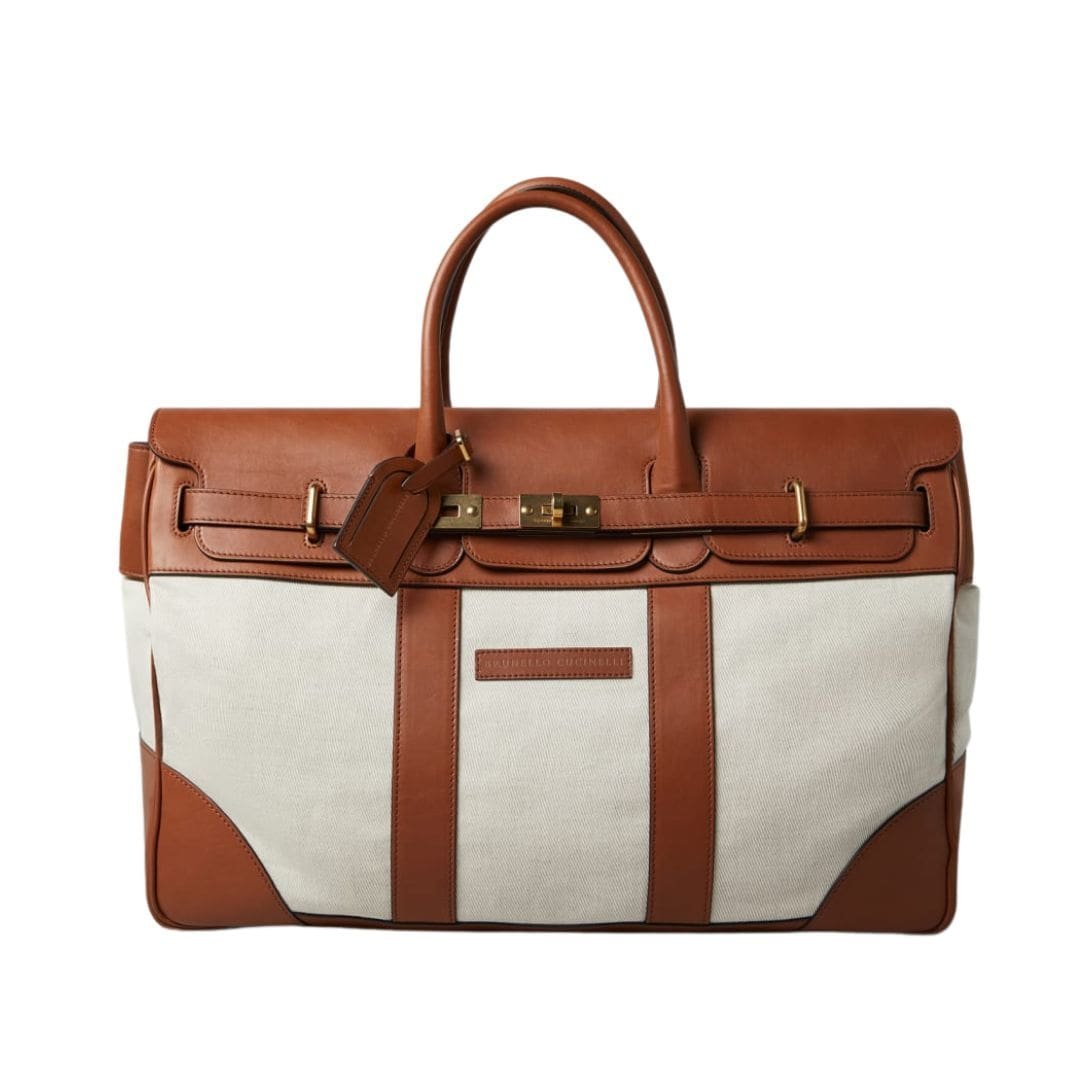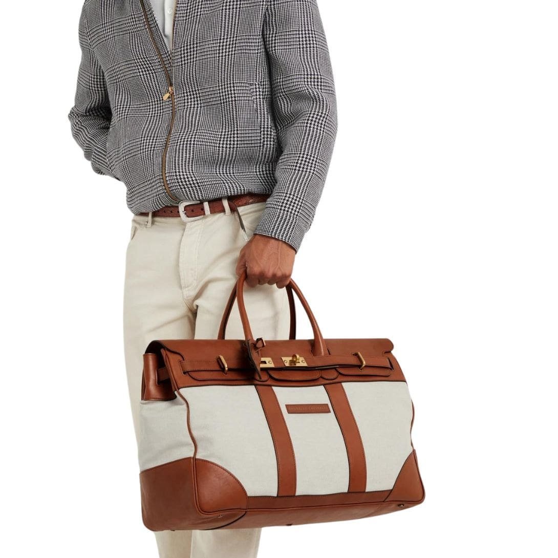 The Brunello Cucinelli Cotton and Linen Cavalry and Calfskin Country Weekender Bag is a quintessential example of luxury and practicality seamlessly blended into one sophisticated accessory. This stylish weekender bag exudes timeless elegance, crafted with the finest materials and meticulous attention to detail. BRUNELLO CUCINELLI COTTON AND LINEN CAVALRY AND CALFSKIN COUNTRY WEEKENDER BAG