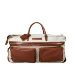 The bag’s exterior is characterized by its clean, structured silhouette, which is both classic and contemporary. The cotton-linen blend lends a breathable, high-quality feel to the bag, making it ideal for travel. The calfskin details, including the sturdy handles and trim, add a touch of opulence and resilience. The handles are ergonomically designed for comfortable grip, while the extendable trolley handle provides ease of movement, making it perfect for navigating through bustling airports or city streets.