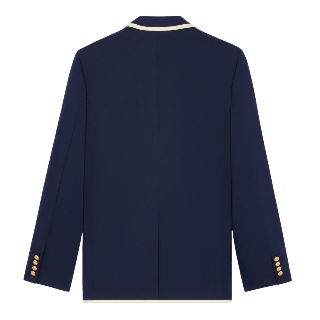 Braided piping details enhance the sophisticated aesthetic, while a middle back vent ensures ease of movement. The blazer is finished with Celine Blason buttons, featuring two on the front and four on the cuffs, adding a distinctive signature touch.