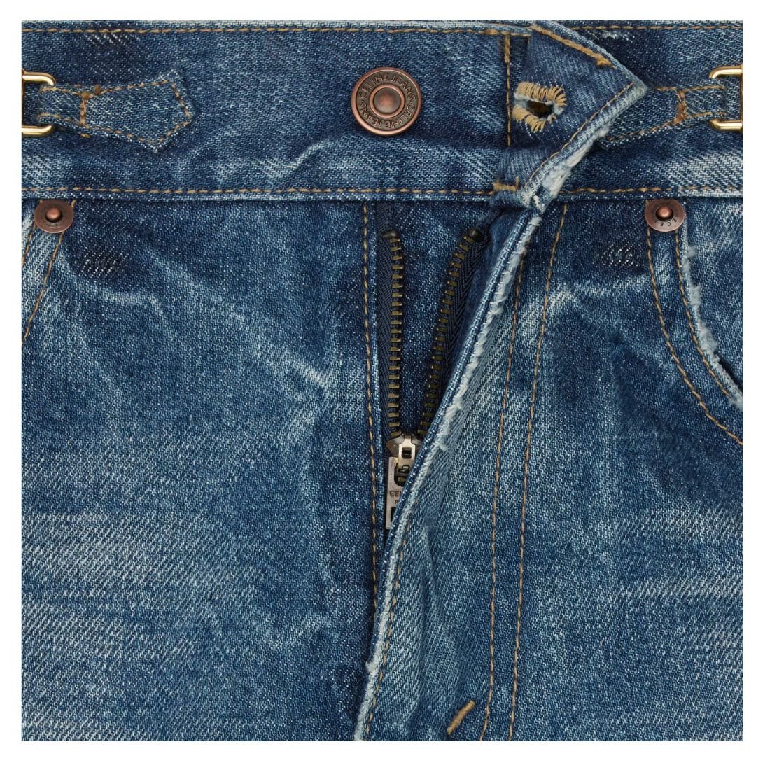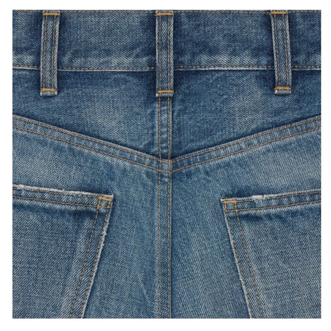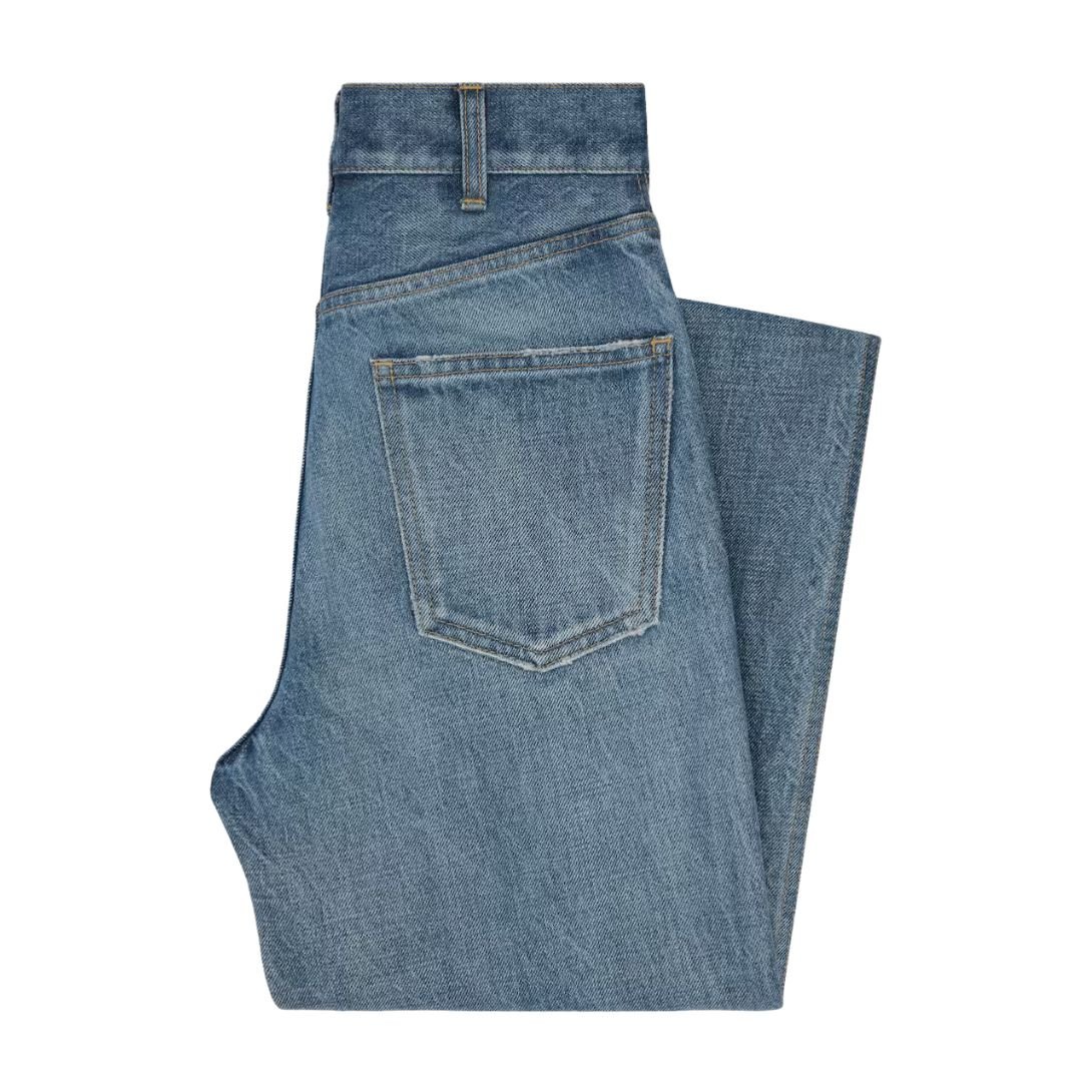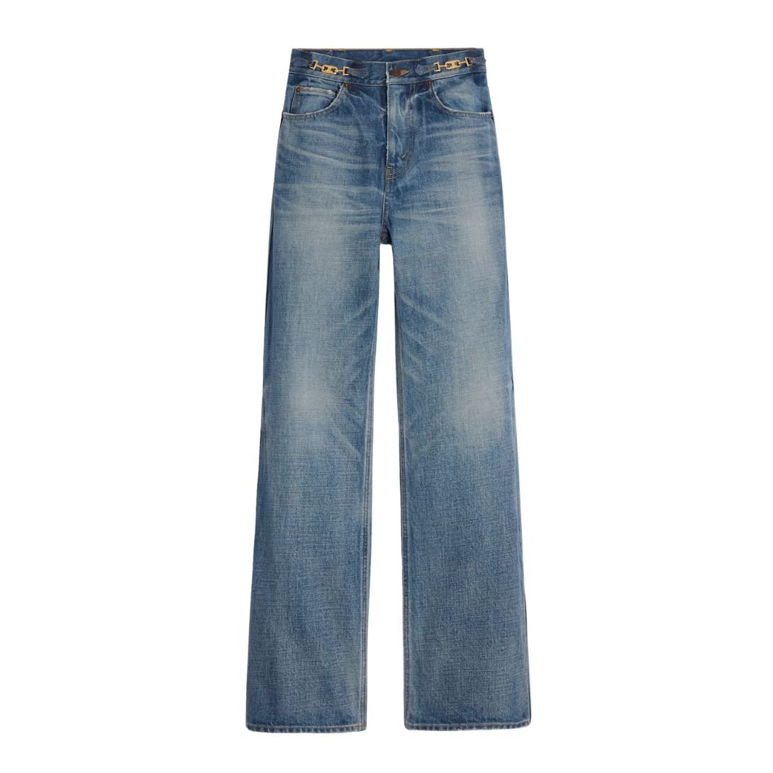 Featuring Triomphe gourmette chains at the waist for an elevated touch of sophistication, complemented by five functional pockets with riveted front pockets for added durability. The Celine jeans-engraved zipper and buttons provide a signature finish.
