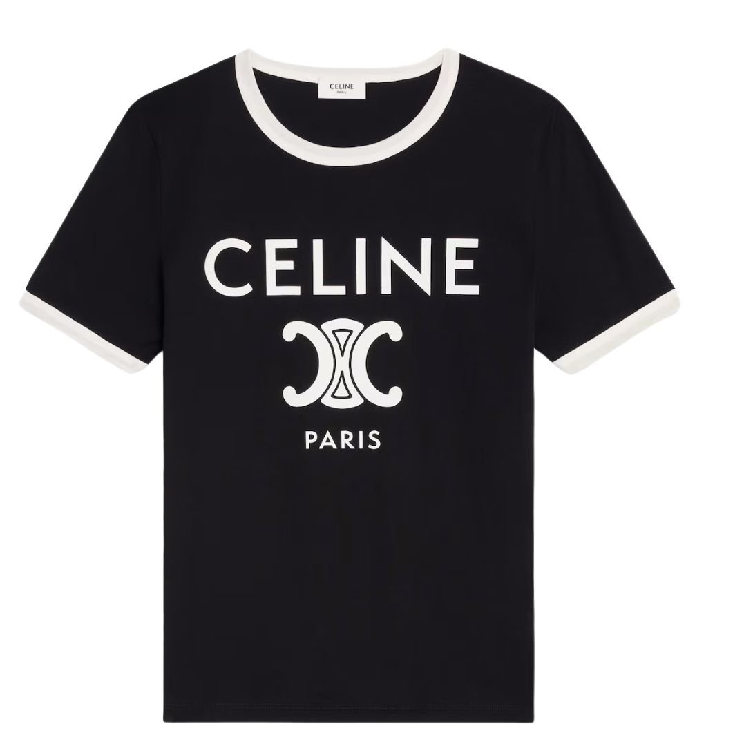 Adorned with the signature Celine Paris Triomphe print, this T-shirt embodies timeless elegance. The bold yet sophisticated design adds a statement touch to any wardrobe.