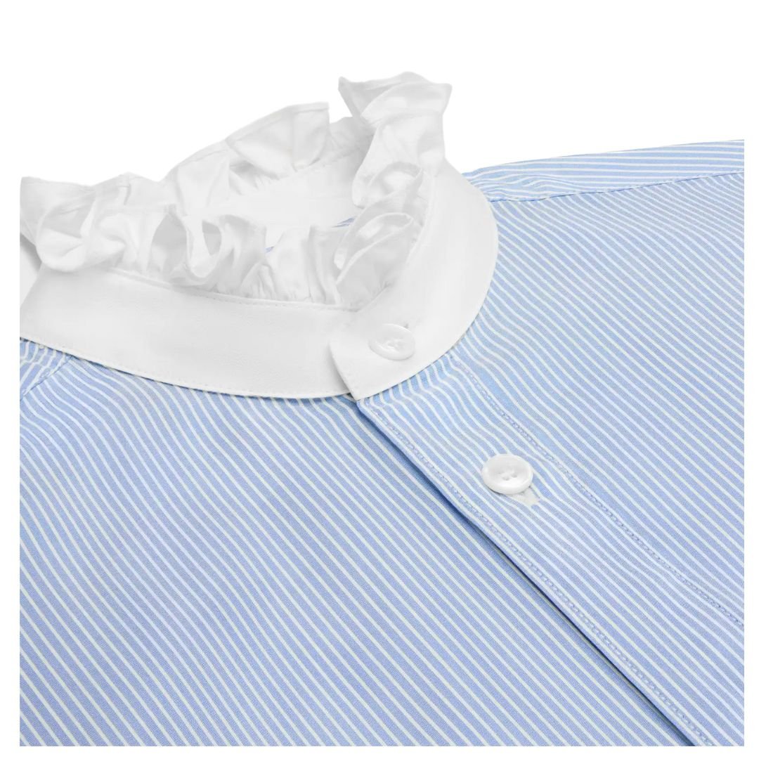 The high stand-up collar, adorned with delicate frills, creates a striking contrast that adds depth and elegance to the design. This refined detail enhances the neckline, making it a statement feature.