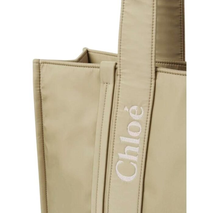 The bag’s sharp, modern lines are accentuated by tonal vertical leather strips, adorned with contrasted topstitching, creating a visually striking design. The signature Chloe logo, carried over from the iconic Woody mule, is reimagined in embroidered calfskin, adding a subtle yet distinctive touch of branding.