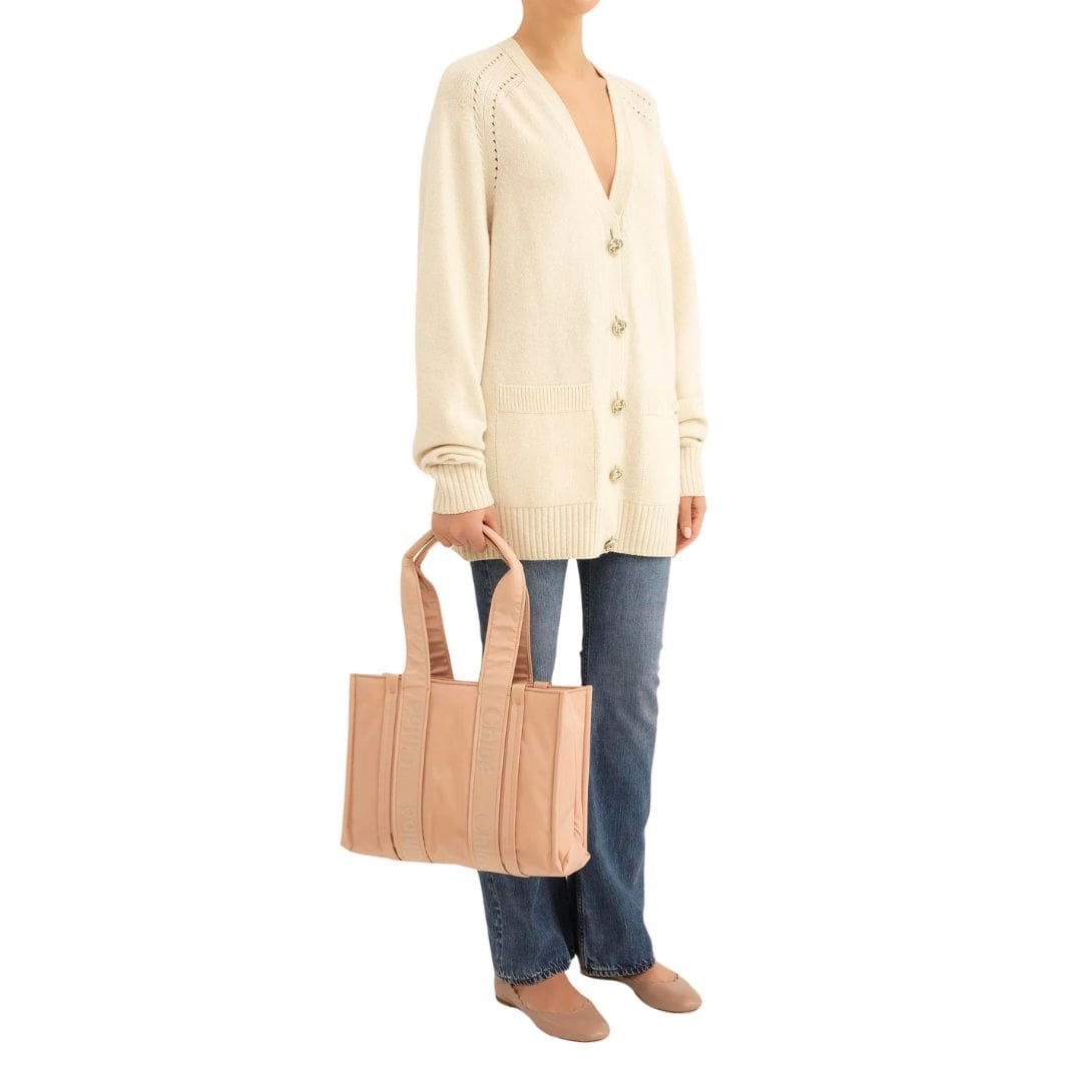 Crafted with a commitment to both style and sustainability, the CHLOE Medium Woody Tote Bag Rose Dust stands as a testament to Chloé’s innovative approach to fashion. Constructed from recycled nylon, this tote embodies a harmonious blend of eco-conscious materials and contemporary design. Its spacious interior, complete with a practical flat pocket, offers ample room for daily essentials, ensuring both functionality and versatility for the modern individual.