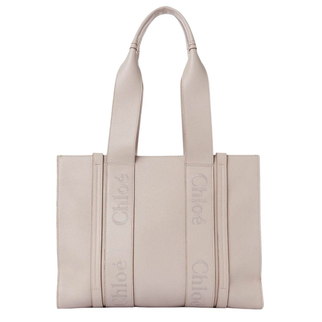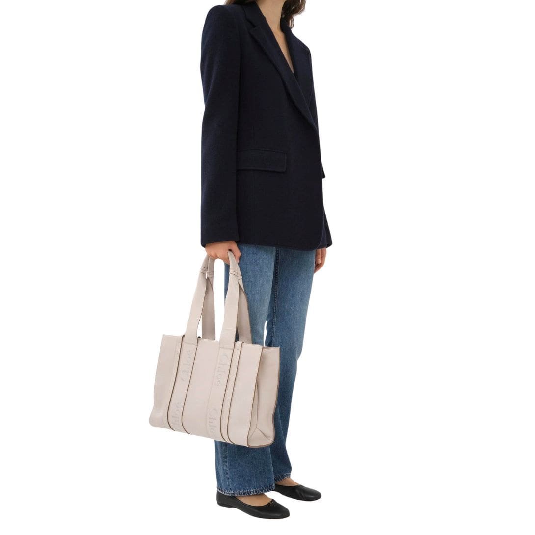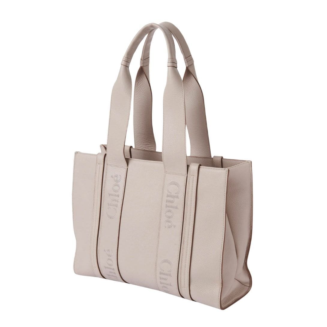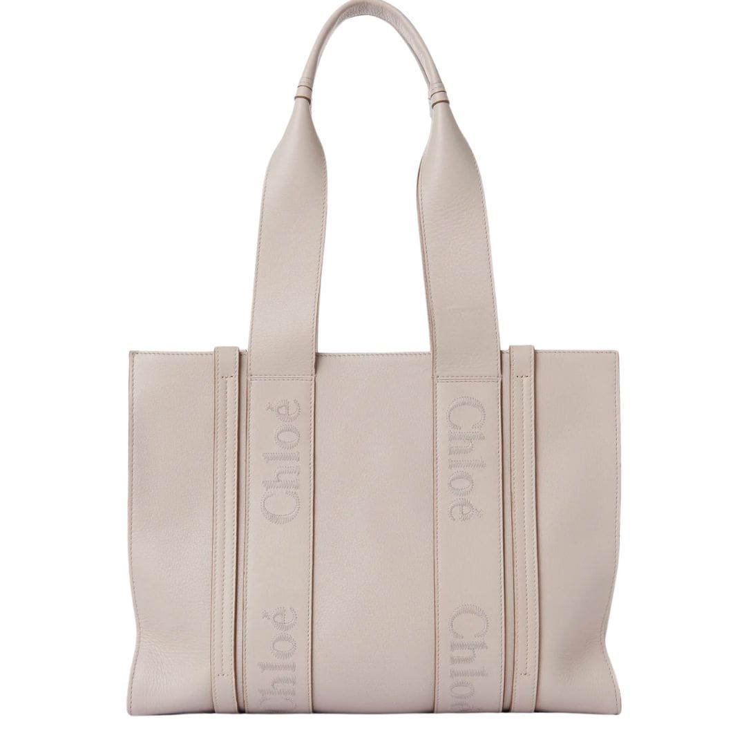 Modern lines, accentuated by vertical leather strips, draw the eye along its minimalist silhouette, while the signature Chloé logo, meticulously embroidered in tonal thread, serves as an emblem of discerning taste. Whether nestled comfortably on the shoulder or elegantly held by hand, the Woody tote exudes an effortless elegance that seamlessly transitions from day to night.