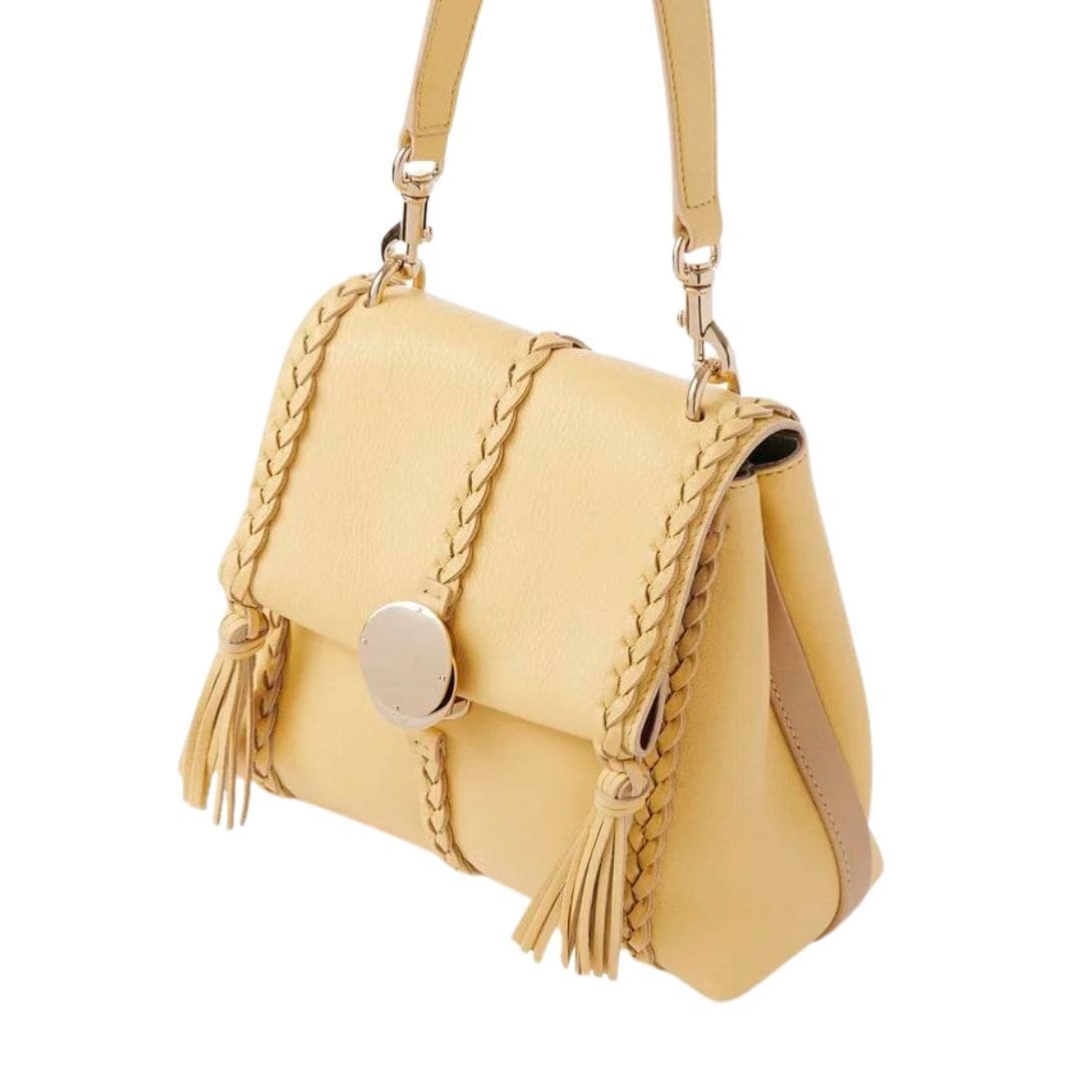 Crafted with meticulous attention to detail, the Chloe Penelope Small Soft Shoulder Bag Softy Yellow. exudes sophistication and elegance. Constructed from naturally grained bull leather, known for its smooth texture, this bag boasts a rounded flap silhouette that embodies a relaxed yet feminine allure. The design is a testament to Chloe’s commitment to impeccable craftsmanship and timeless style, featuring refined details such as leather braiding, dangling tassels, and contrasting hardware.