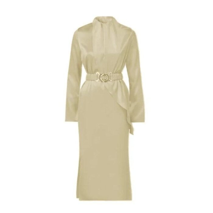 The Dodo Bar OR Berna dress is crafted from silk and features a closed neck with a draped scarf. It is combined with a separate belt featuring a gold buckle.