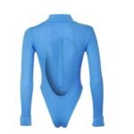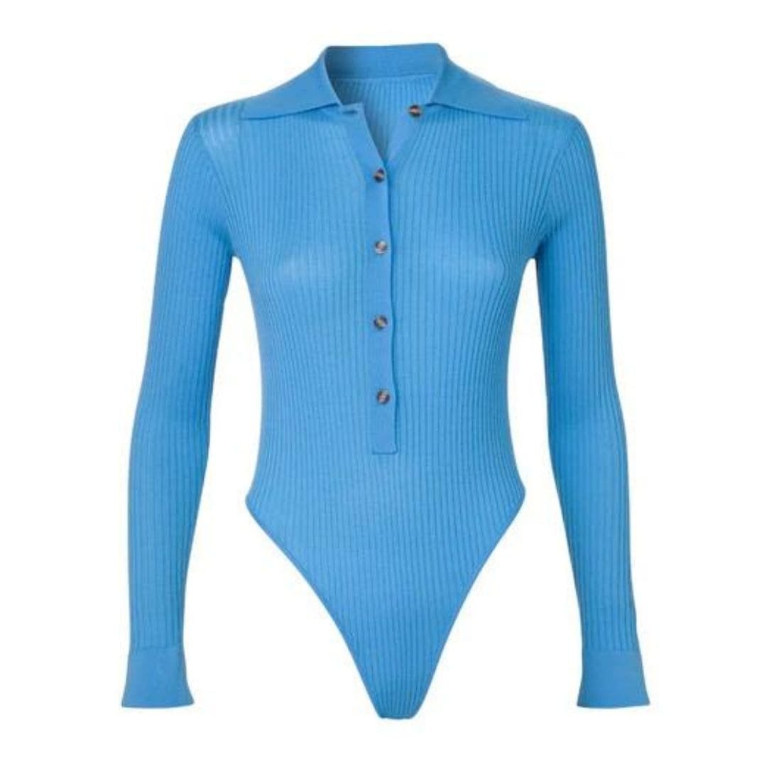 The Dodo Bar or Gabi Bodysuit is tailored for a snug fit, featuring a ribbed knit, a collar, a buttoning top, and a distinctive cut-out back detail.