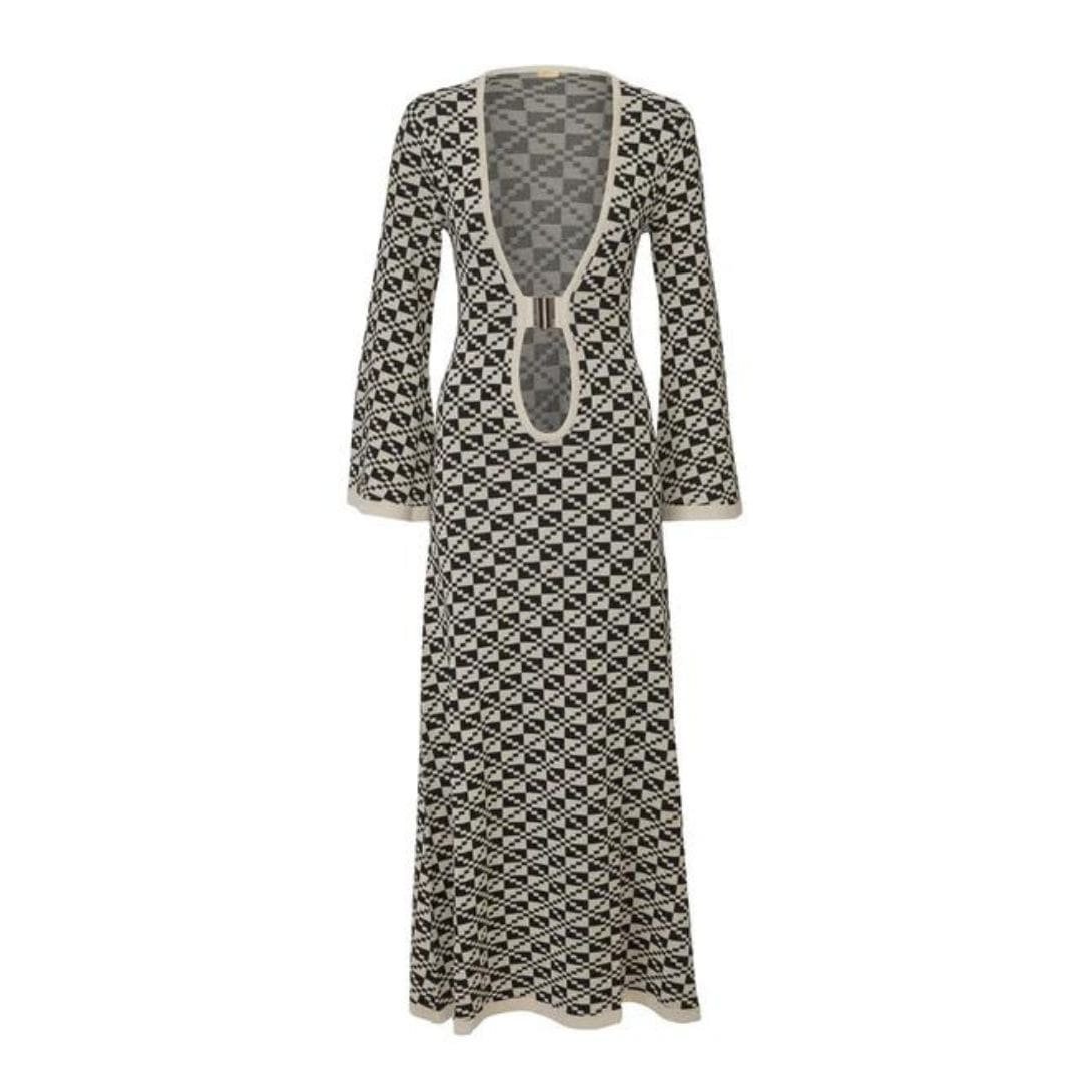 The Dodo Bar OR Lori Dress’ is crafted in a relaxed silhouette, featuring a plunging neckline held together by a gold buckle and adorned with fluted sleeves.