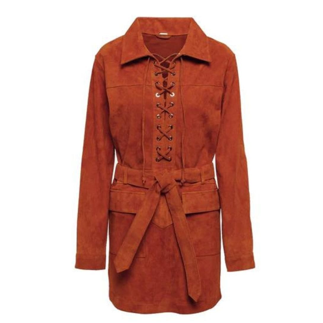 The Dodo Bar OR Marina Mini Dress’ is crafted from black suede, featuring a long-sleeved silhouette with an elasticated lace closure in the front. It includes a tonal belt that cinches the waist and ties at the front, along with flap pockets.