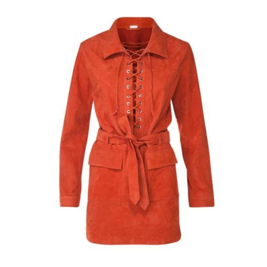 The Dodo Bar OR Marina Mini Dress’ is crafted from black suede, featuring a long-sleeved silhouette with an elasticated lace closure in the front. It includes a tonal belt that cinches the waist and ties at the front, along with flap pockets.
