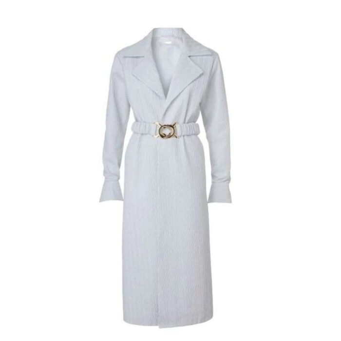 The Dodo Bar OR Mia dress is crafted from pleated leather and features a biker collar, wide notch lapels, and a V-neckline. It includes button cuffs and a ruched belt that cinches at the waist for a contoured effect.