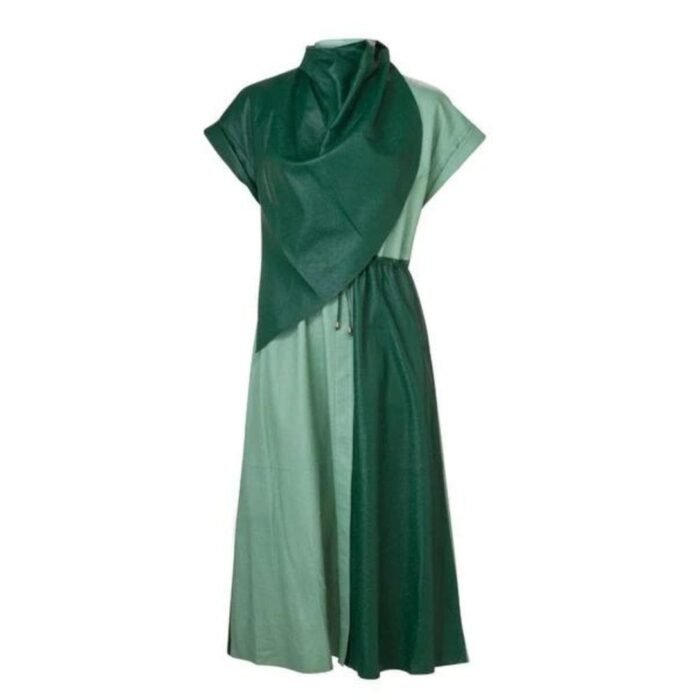 The Dodo Bar OR Paula dress is crafted from a two-tone ostrich-printed leather and features an oversized shawl collar with an adjustable drawstring waist.