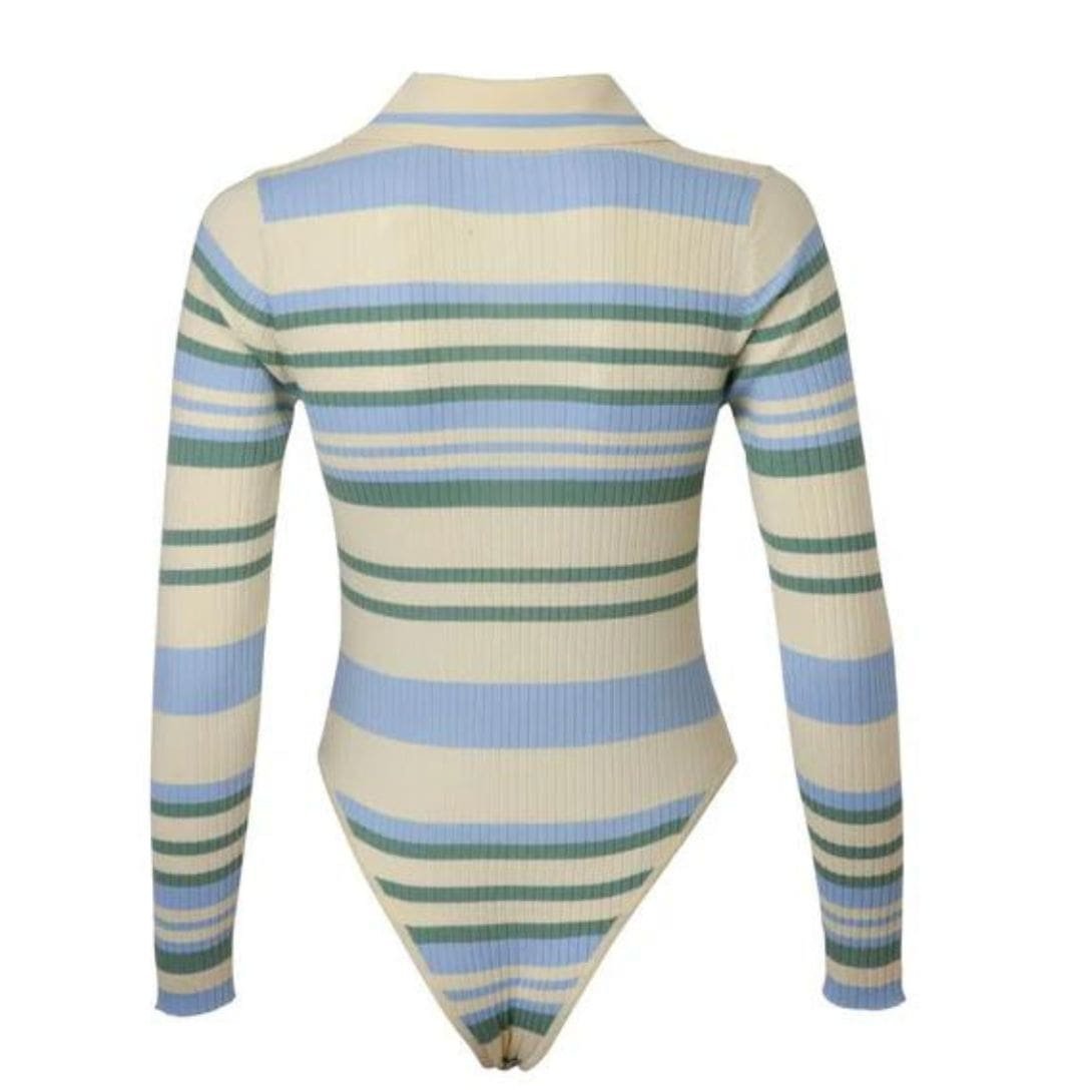 The doDO BAR OR Penny Bodysuit is designed for a tight fit and features knitted stripes, an accentuated collar, and a buttoning top.