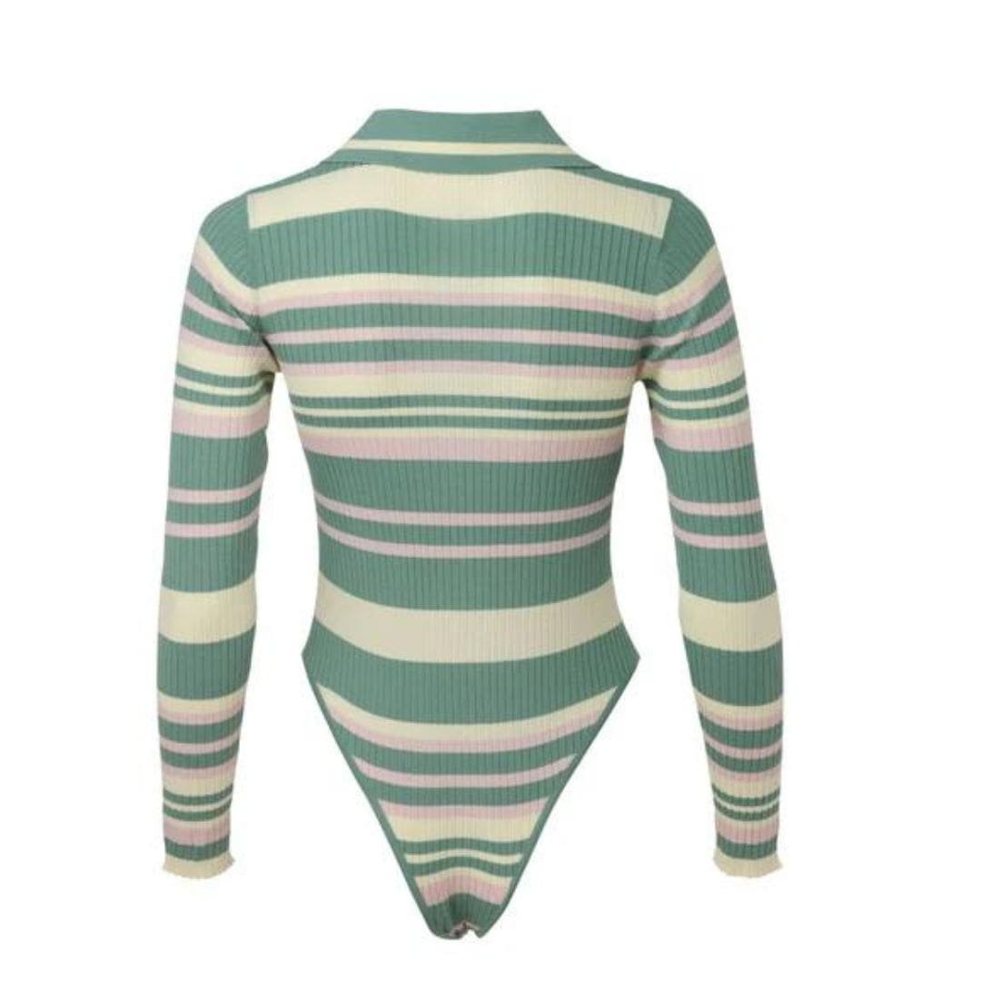 The doDO BAR OR Penny Bodysuit is designed for a tight fit and features knitted stripes, an accentuated collar, and a buttoning top.