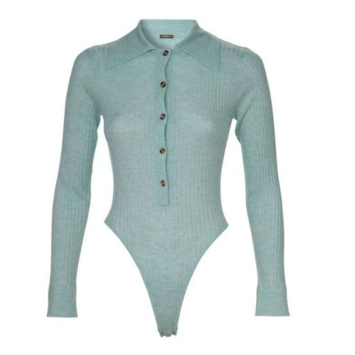 The Dodo Bar or Pollie Bodysuit is tailored for a snug fit, featuring a ribbed knit, a collar, a buttoning top, and a distinctive cut-out back detail.