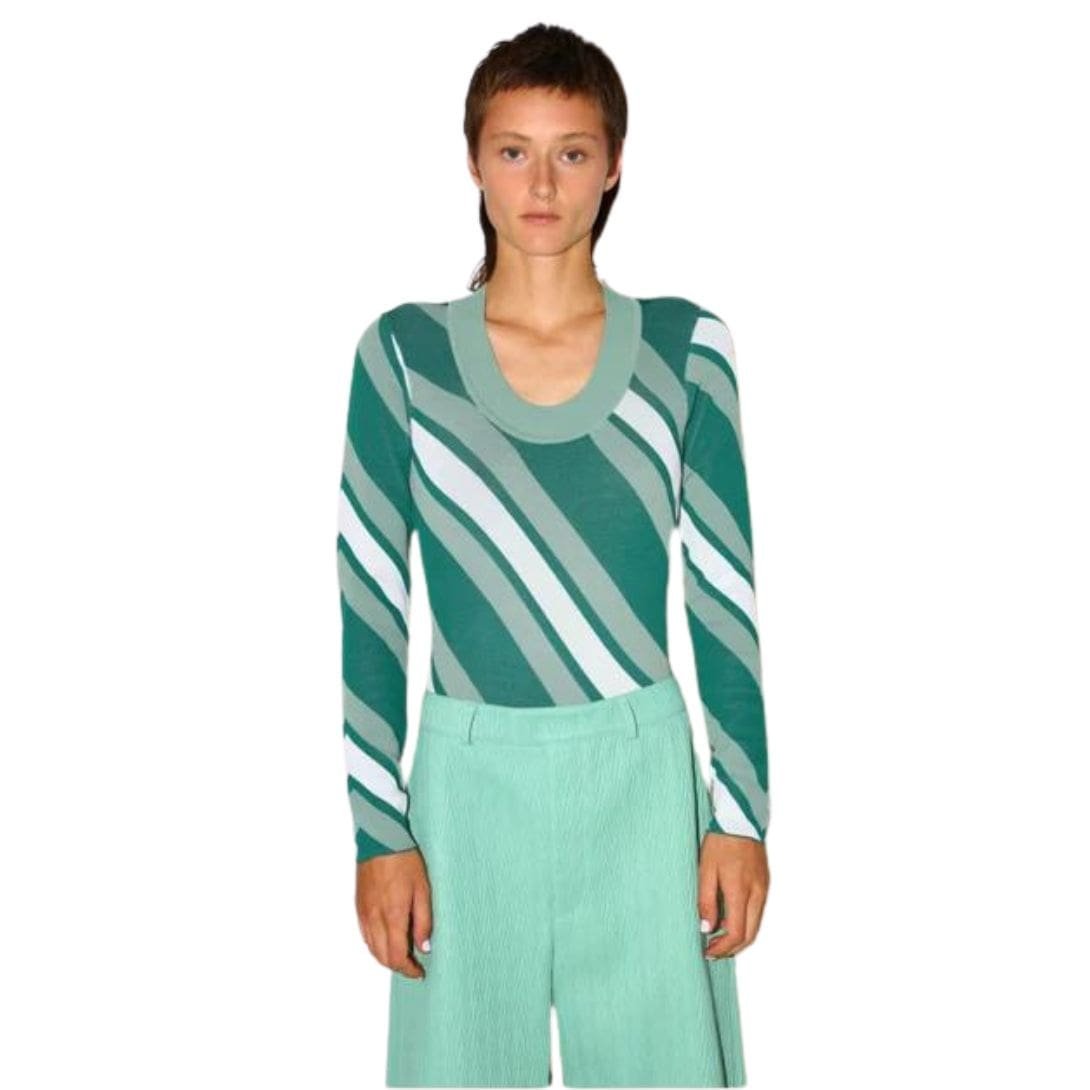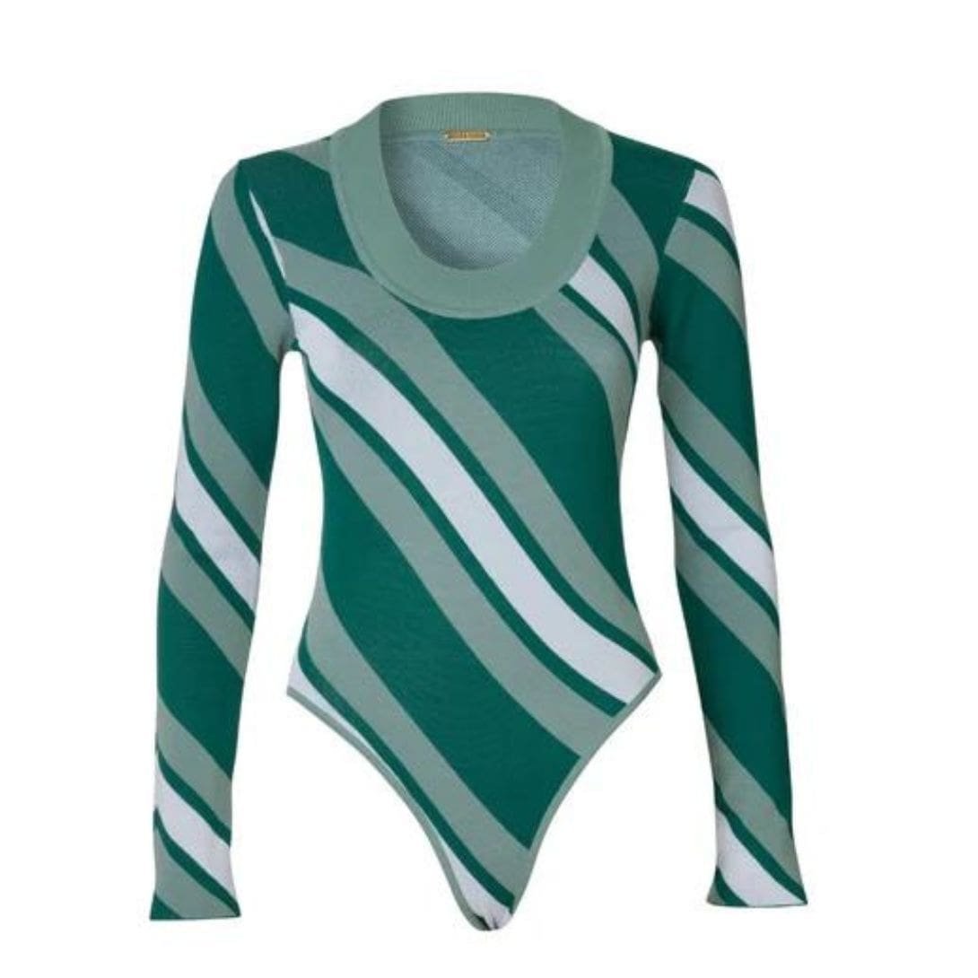 The dodo bar or Summer Bodysuit’ offers a snug fit with a stylish round neckline and a diagonal-striped pattern.