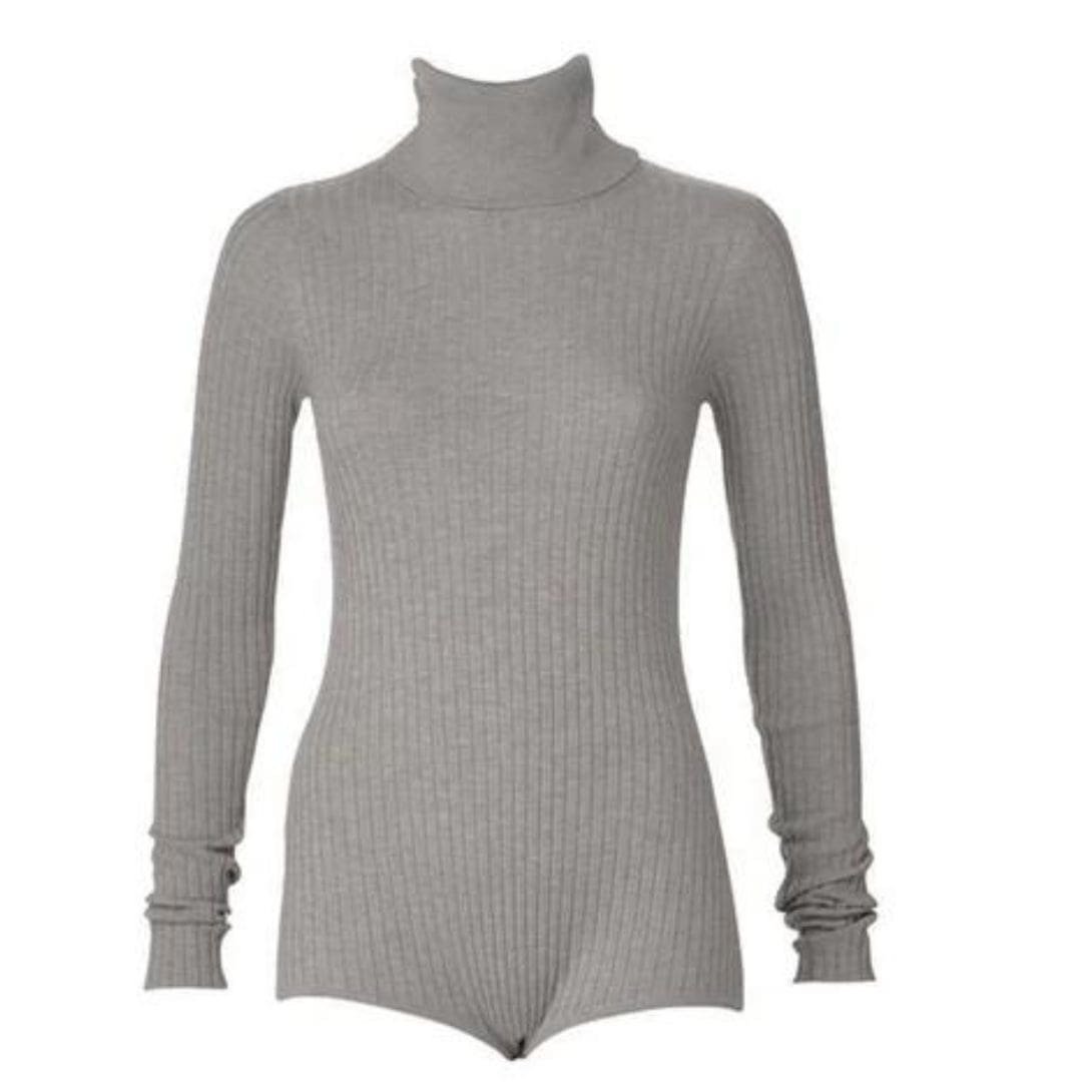 The DODO bar or Ziggy Bodysuit is crafted from ribbed knit and features long sleeves, a high neck, and a circle cut-out back embellished with crystal chains.