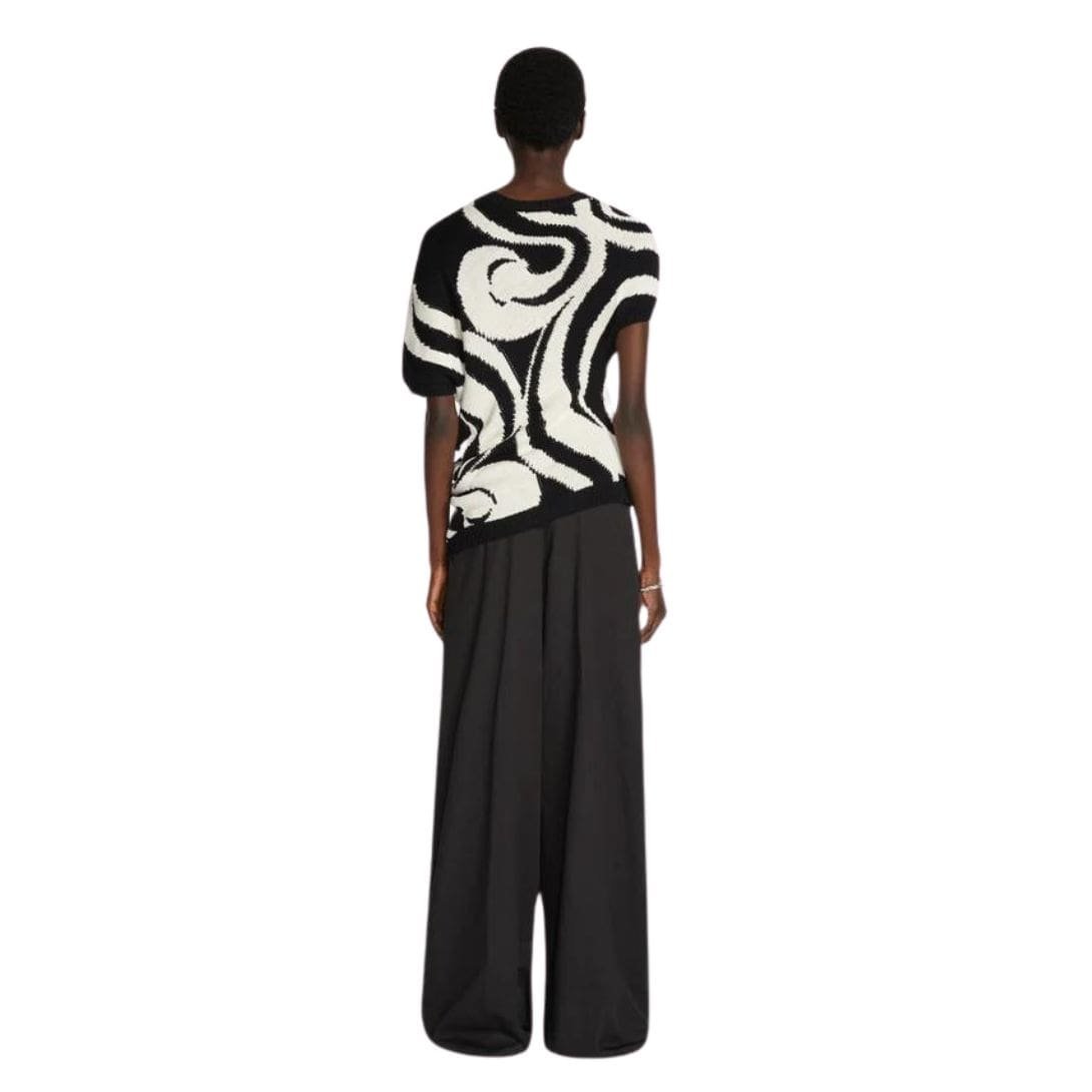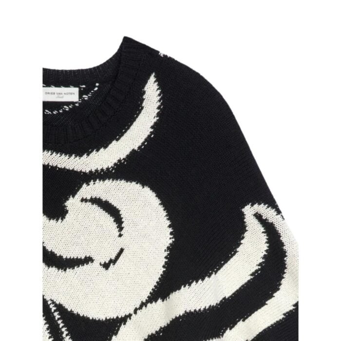 Dries Van Noten Asymmetrical Sweater Black. combines artistic flair with comfort, crafted from 100% Cotton. Featuring an abstract intarsia motif, regular fit, asymmetrical cut and sleeves, short sleeves, and a round neckline, this sweater offers a contemporary twist on classic design.