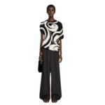 The Dries Van Noten Asymmetrical Sweater showcases an abstract intarsia motif that adds a unique and artistic touch to the sweater. This intricate pattern exemplifies Dries Van Noten’s innovative approach to design, making it a standout piece in any wardrobe.