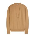 Dries Van Noten Cashmere Sweater Camel. epitomizes luxury and elegance, crafted entirely from 100% Cashmere. This sweater features a regular fit and a deep V neckline, offering timeless style and exceptional comfort.