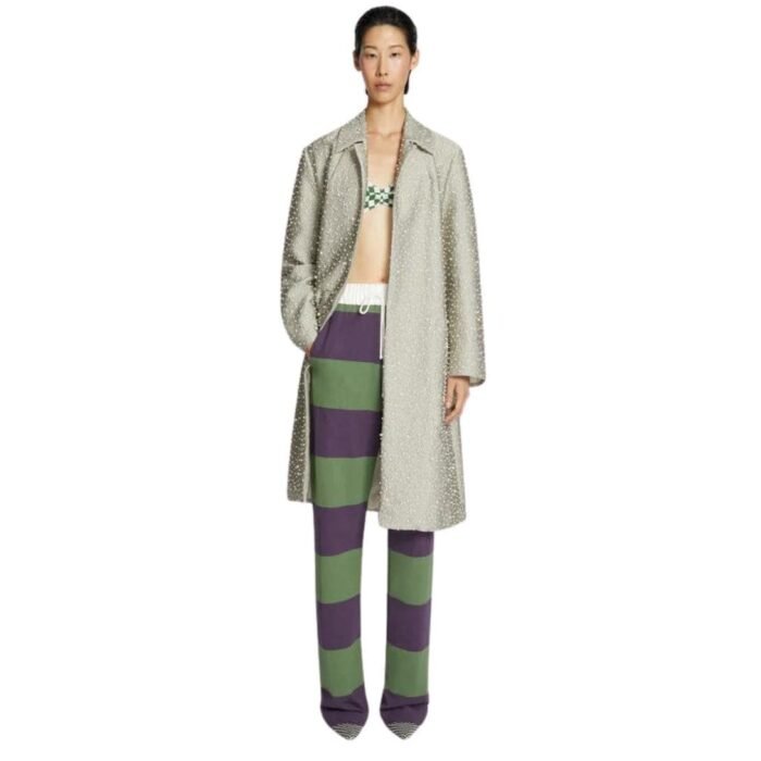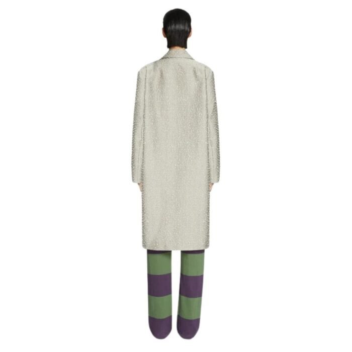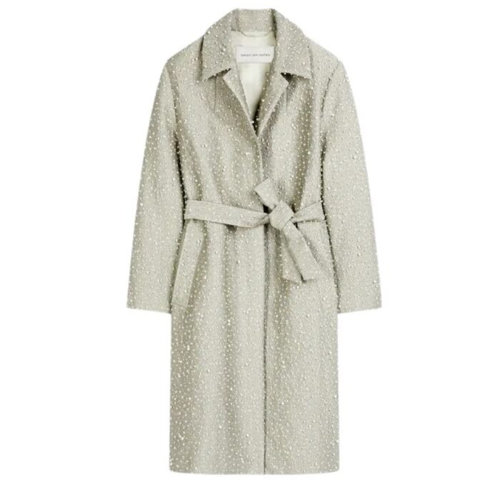 In summary, the Dries Van Noten Embellished Coat in Silver is a stunning showcase of luxury and style. Its all-over pearl embellishments, flattering silhouette, and impeccable craftsmanship make it a standout piece that will elevate any ensemble with effortless glamour and sophistication.