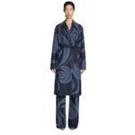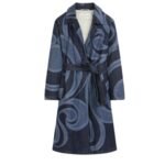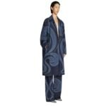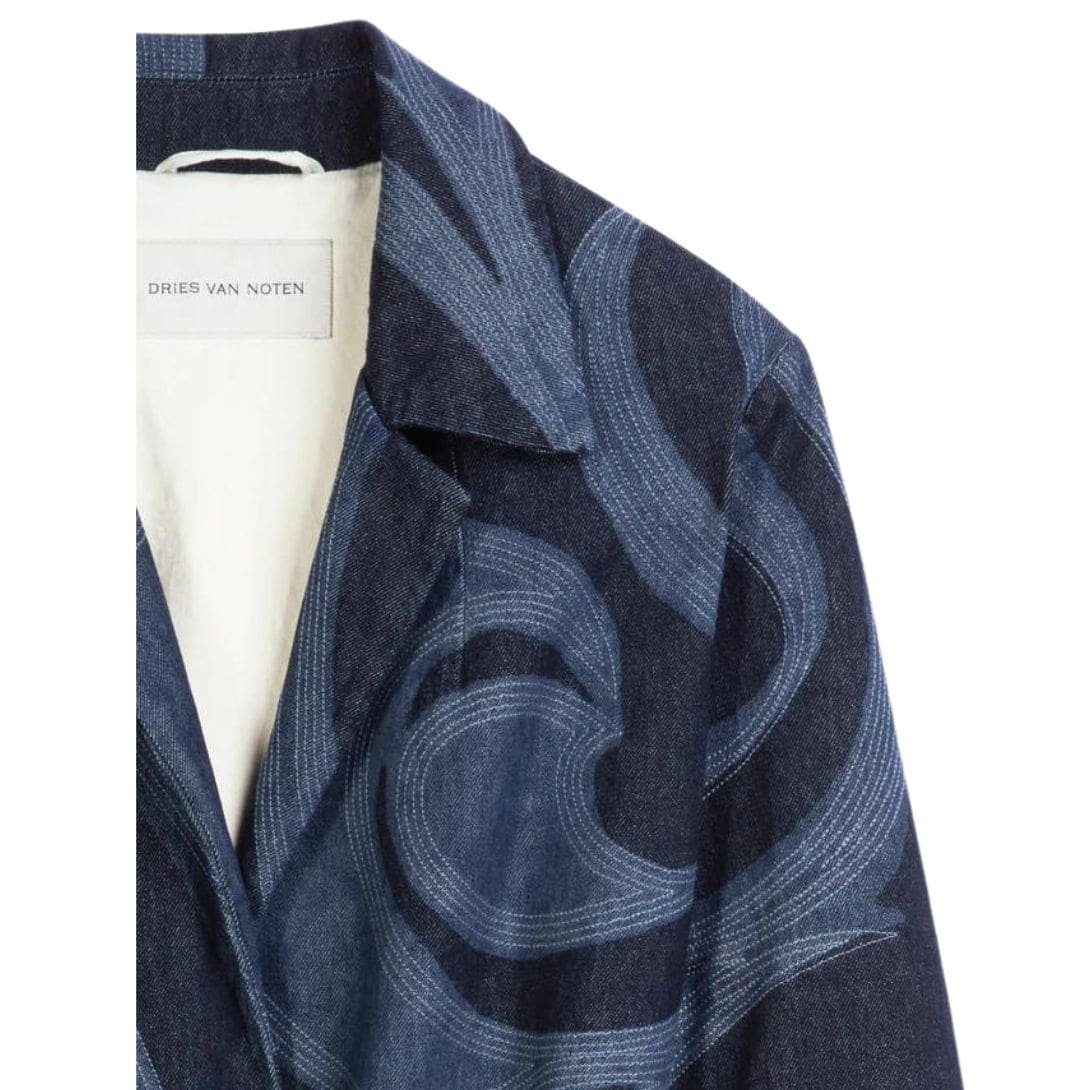 In summary, the Dries Van Noten Embroidered Coat in Indigo is a stunning showcase of craftsmanship and contemporary design. Its laser-printed swirl pattern, delicate yarn embroidery, and flattering silhouette make it a standout piece that will elevate any ensemble with effortless elegance.