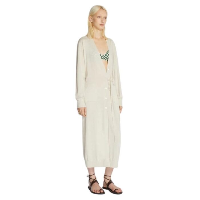 Dries Van Noten Long Merino Cardigan Ecru. exemplifies elegance and comfort, crafted entirely from 100% Merino Wool. This luxurious cardigan features a loose fit, calf-length design, deep V neckline, and practical front patch pockets with a front button and tie closure, making it a versatile and stylish addition to any wardrobe.