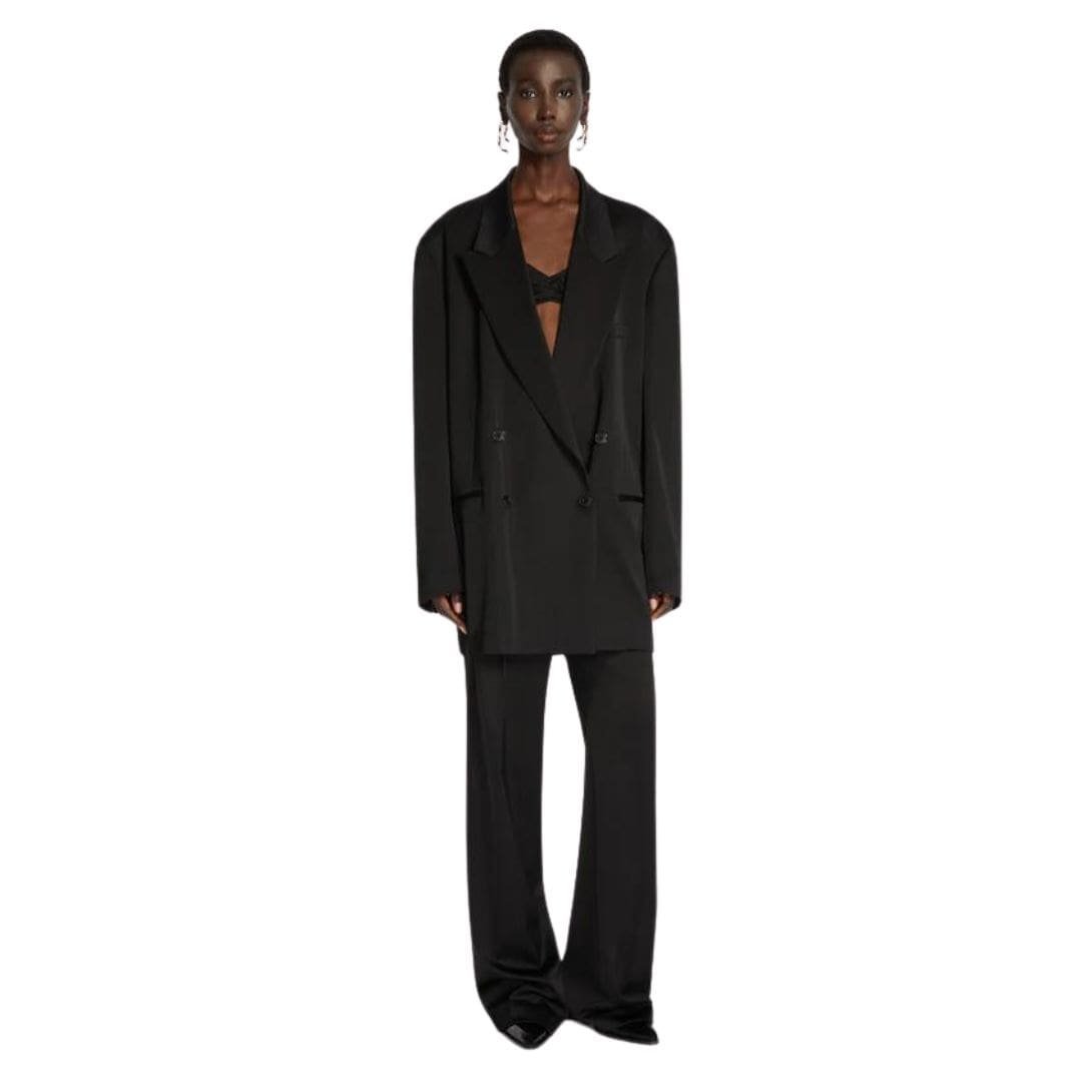 The oversized fit of this blazer adds a contemporary flair to traditional tailoring, providing a relaxed yet sophisticated silhouette that effortlessly complements any wardrobe. With a double-breasted design, it exudes timeless elegance, accentuated by its refined detailing and impeccable craftsmanship.
