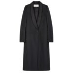 Elevating the coat’s aesthetic are the distinctive pagoda shoulders, which add a touch of architectural flair and lend a regal air to the ensemble. Meanwhile, the front jetted pockets and welt pocket at the chest offer both style and functionality, providing convenient storage for small essentials while maintaining a clean, streamlined silhouette.