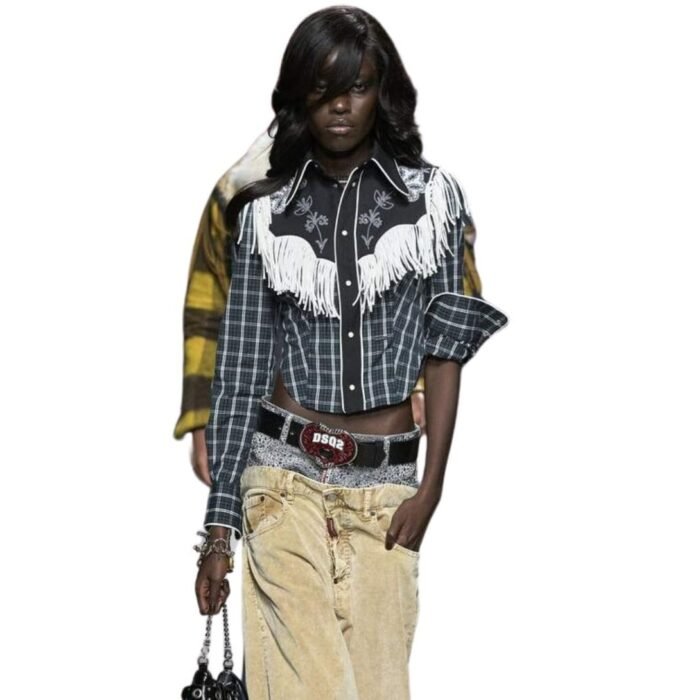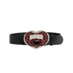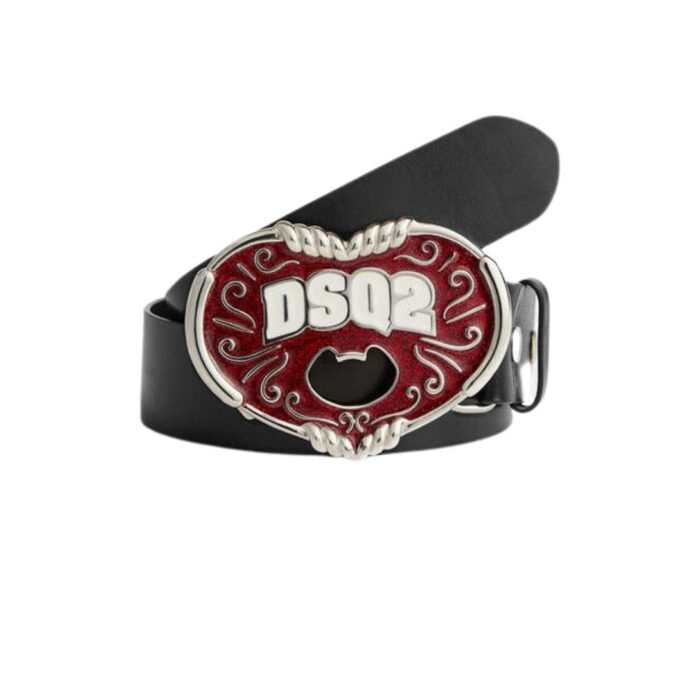 At the heart of this accessory is its iconic plaque buckle, adorned with the DSQ2 logo in bold lettering, serving as a testament to the brand’s legacy and design ethos. The buckle’s sleek, polished finish exudes sophistication, while its substantial size commands attention, making it a statement piece for any outfit.