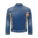 The jacket is made from high-quality denim, ensuring durability and comfort. The medium spots wash gives it a worn-in, vintage aesthetic, characterized by a mix of dark and light blue hues interspersed with deliberate, artistic spots and fading. This treatment not only adds visual interest but also enhances the jacket’s texture, providing a tactile richness.
