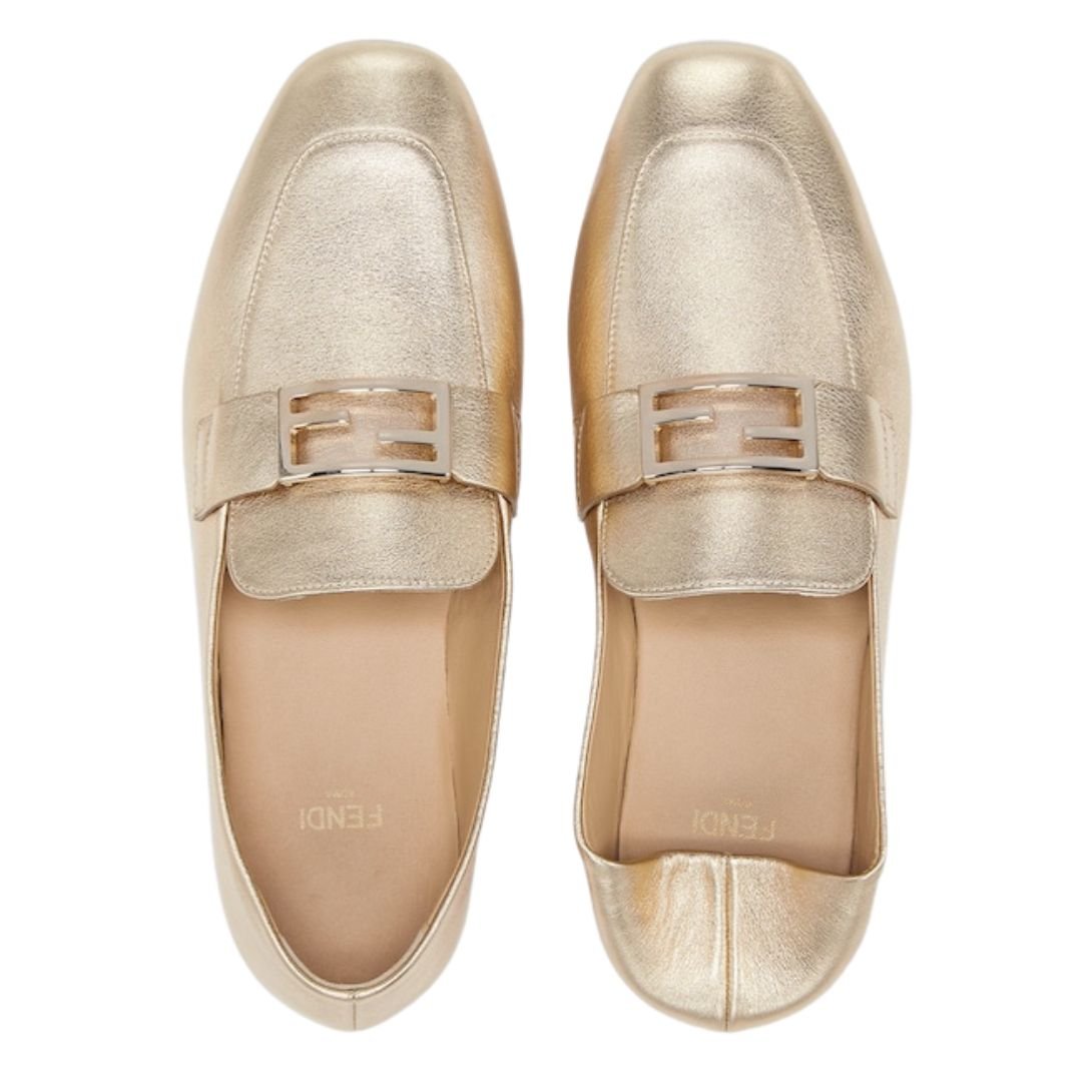 FENDI BAGUETTE METALLIC CHAMPAGNE-COLORED LEATHER LOAFERS