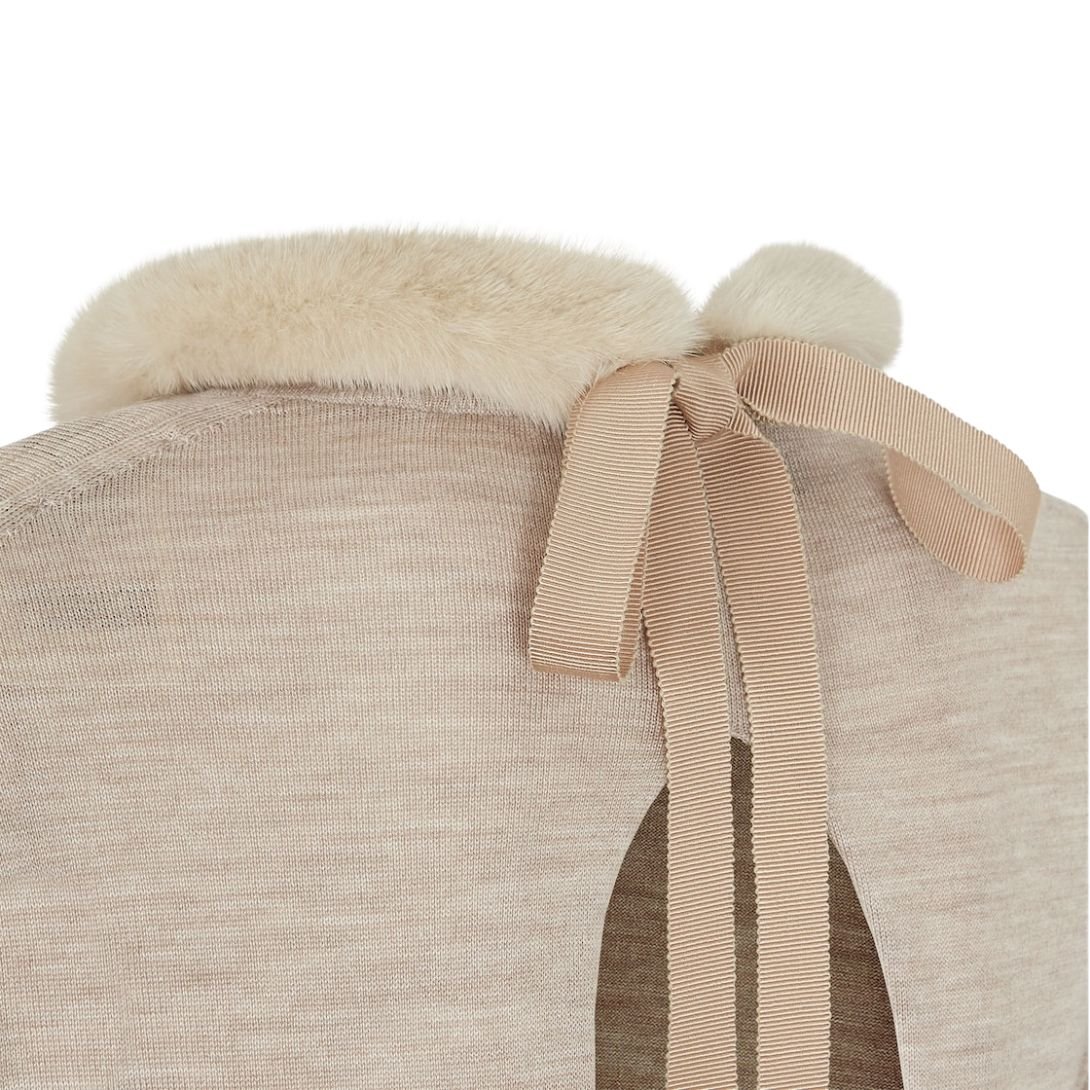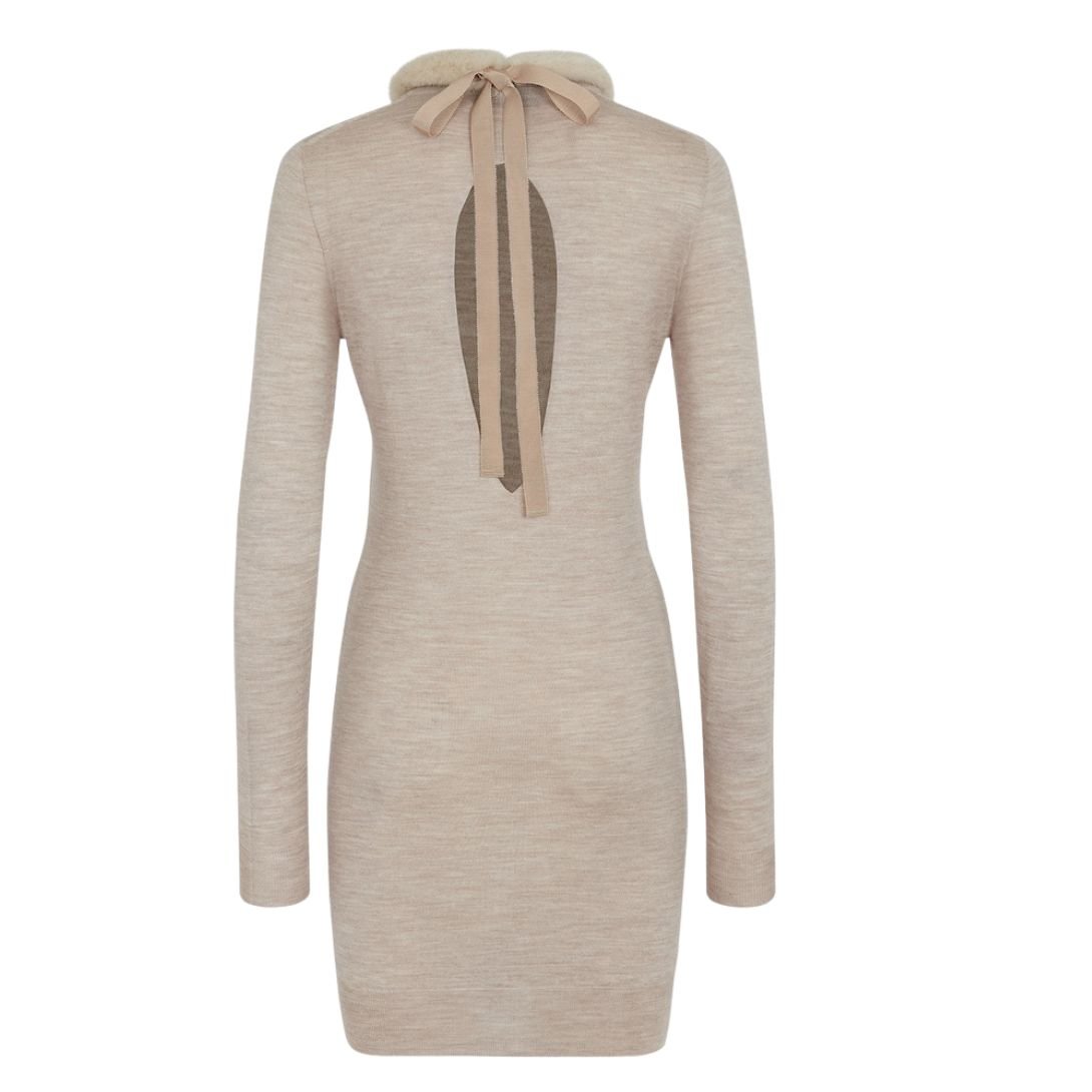 The dress is enhanced by a removable collar in matching mink, secured with grosgrain ribbons that tie at the back for an elegant finish. A contrasting Fendi Roma logo intarsia on the hem adds a signature touch to the design.