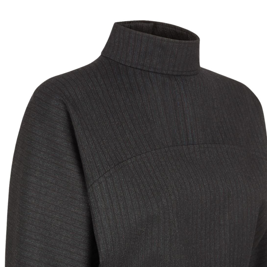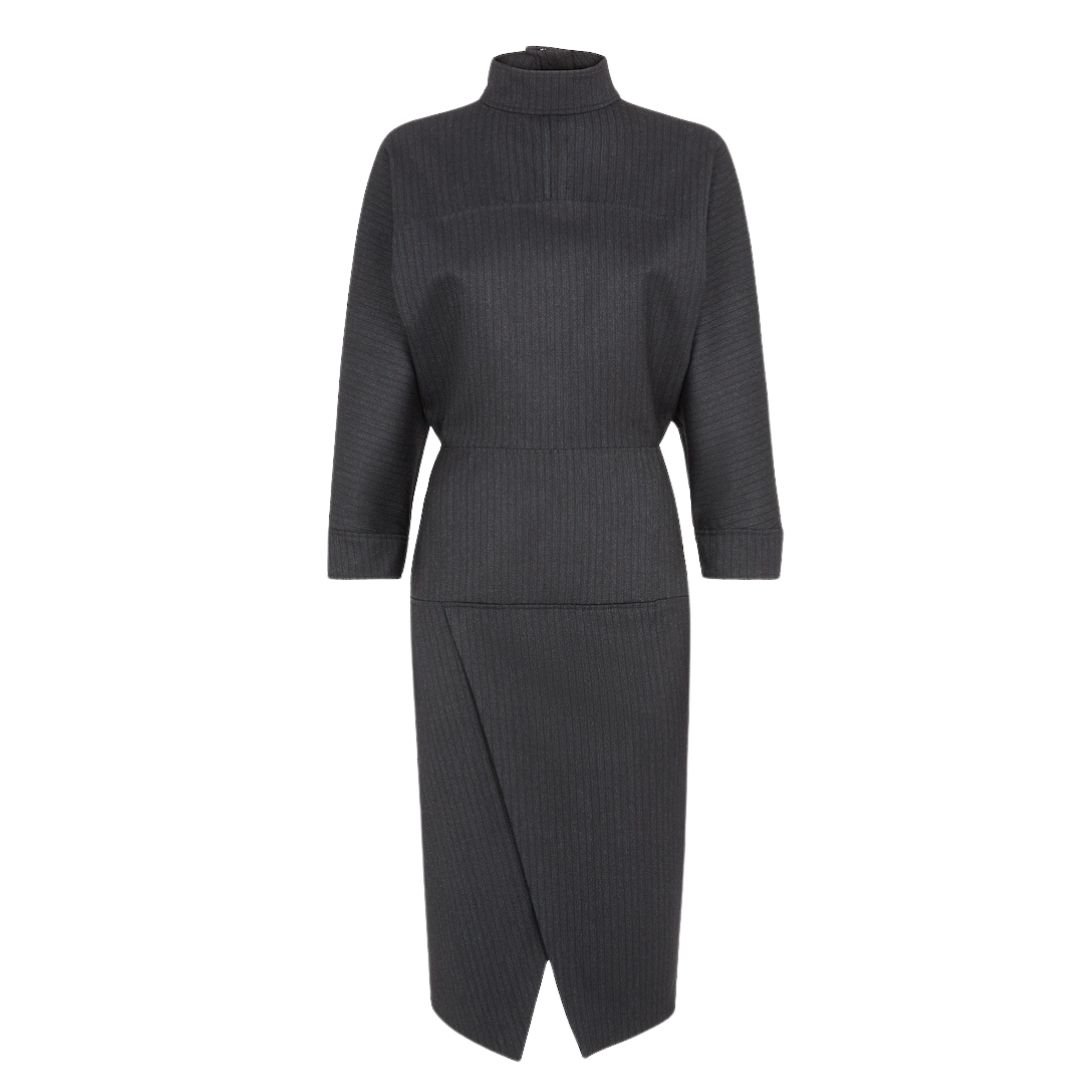 Made from gray pinstriped wool, the dress offers a timeless, classic appeal. The fabric provides both structure and comfort, making it an ideal choice for those looking for versatility and style.